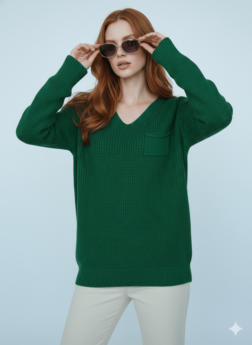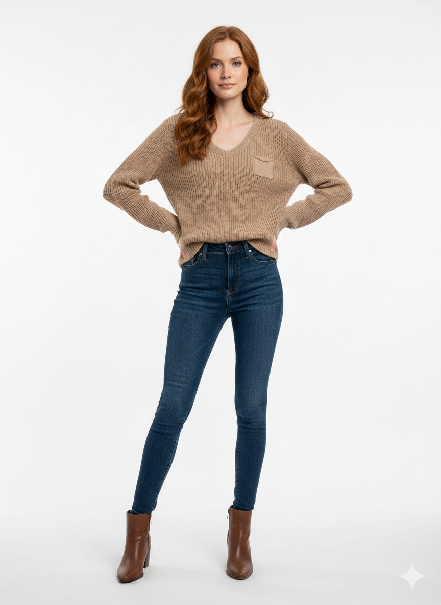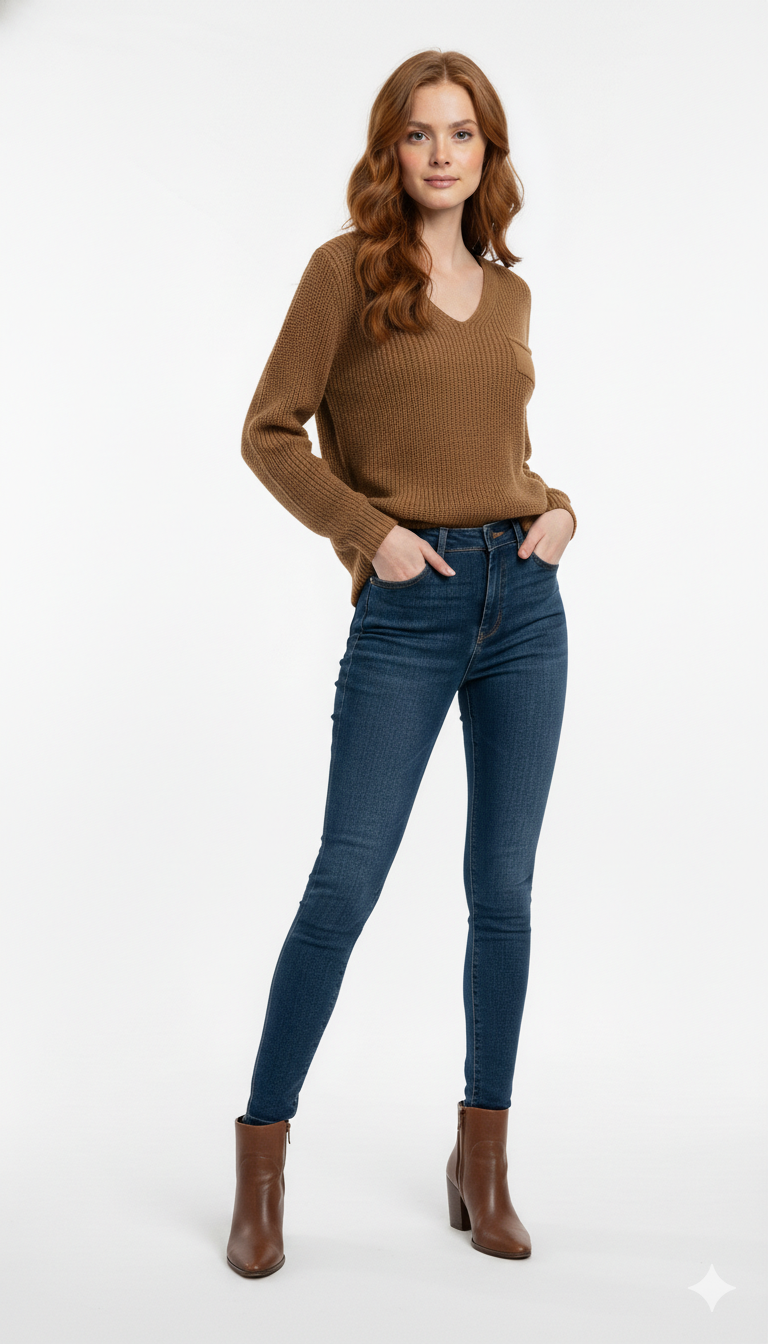 O decote em V valoriza o colo de forma elegante, enquanto o bolsinho frontal adiciona charme e um detalhe funcional que deixa a peça ainda mais especial. As mangas longas com punhos ajustados garantem um caimento confortável e moderno.