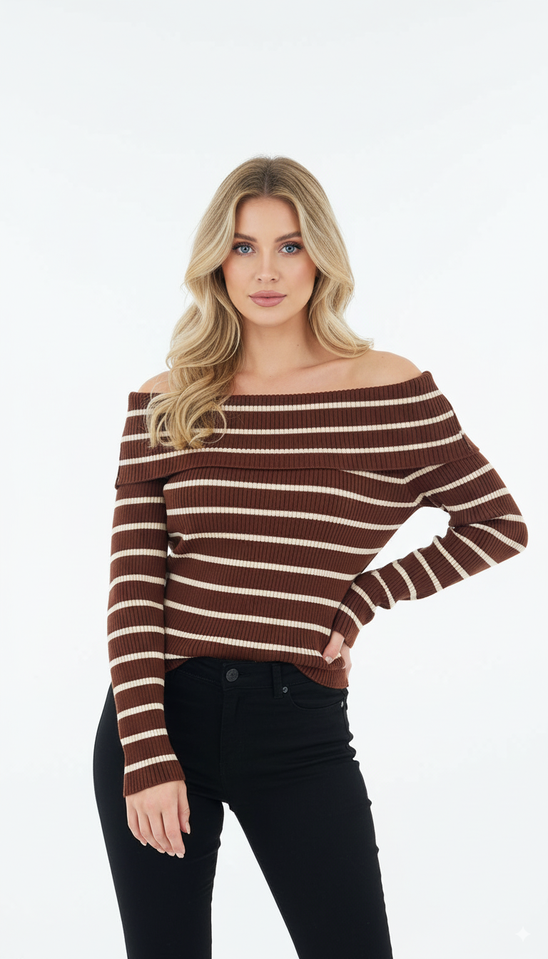 A Blusa Ombro a Ombro Listrada é a combinação perfeita de elegância e estilo casual. Confeccionada em tricot macio e de alta qualidade, valoriza o colo com o decote ombro a ombro, trazendo um toque feminino e moderno. As listras clássicas acrescentam charme atemporal, enquanto a modelagem ajustada garante caimento confortável e sofisticado. Ideal para produções que vão do dia a dia a ocasiões especiais.