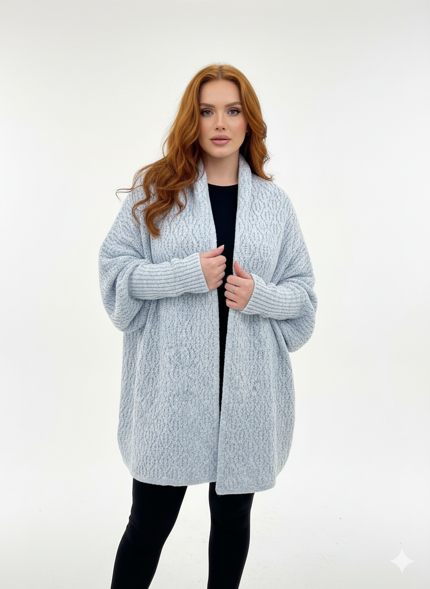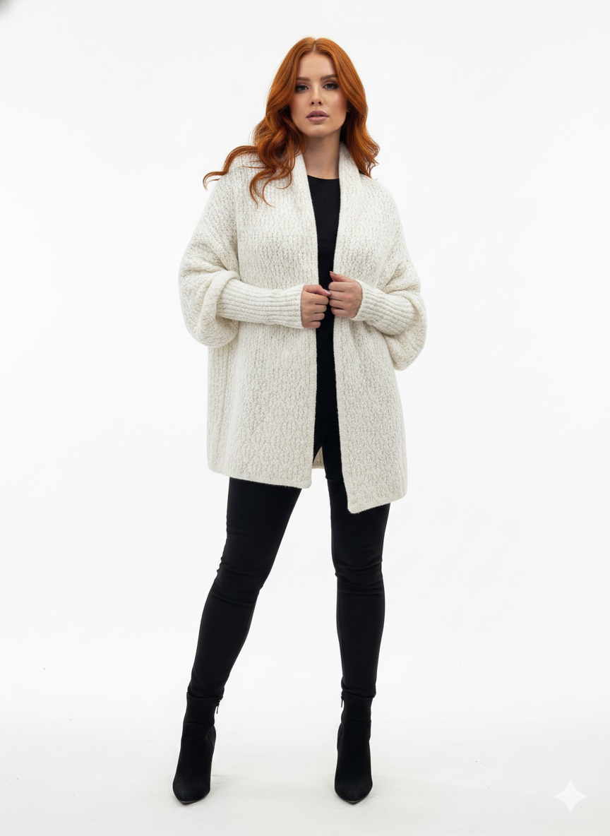 A Capa Detalhada Mousse tem modelagem ampla e confortável, com toque extremamente macio e aconchegante. O caimento soltinho deixa a produção elegante sem esforço, perfeita para dias frios ou meia-estação.