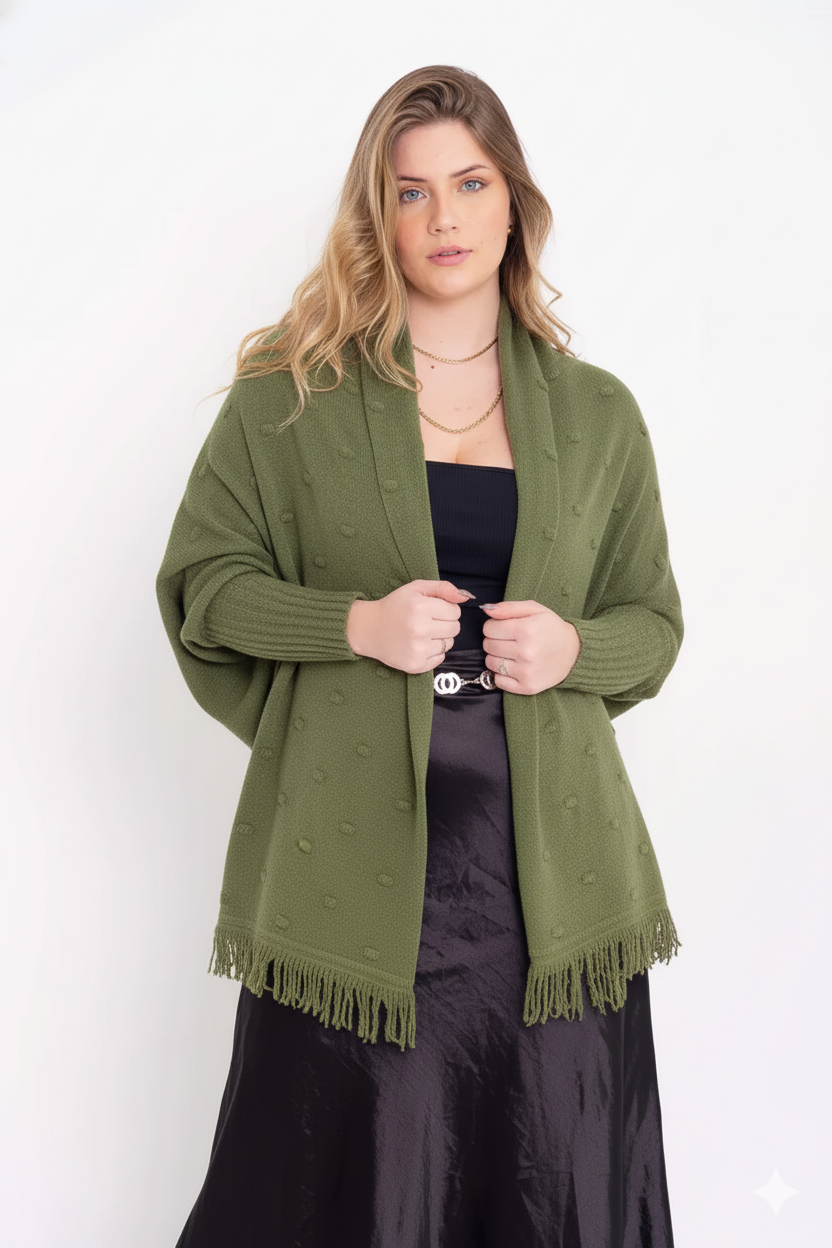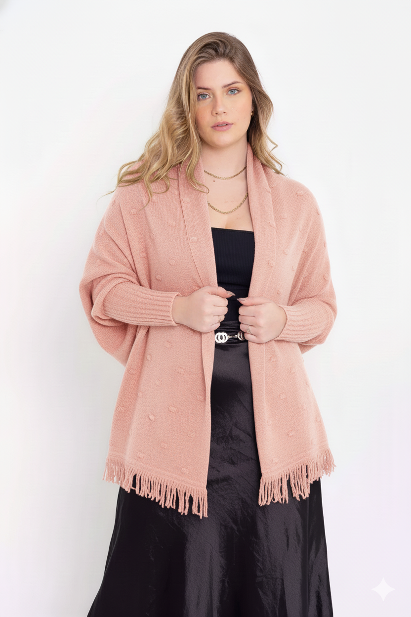 A Capa Pipoca Mousse é a peça ideal para transformar qualquer look com charme e autenticidade. Com modelagem ampla e fluída, ela traz o diferencial da textura em ponto pipoca combinada ao acabamento em franjas, que garantem movimento e um toque moderno.