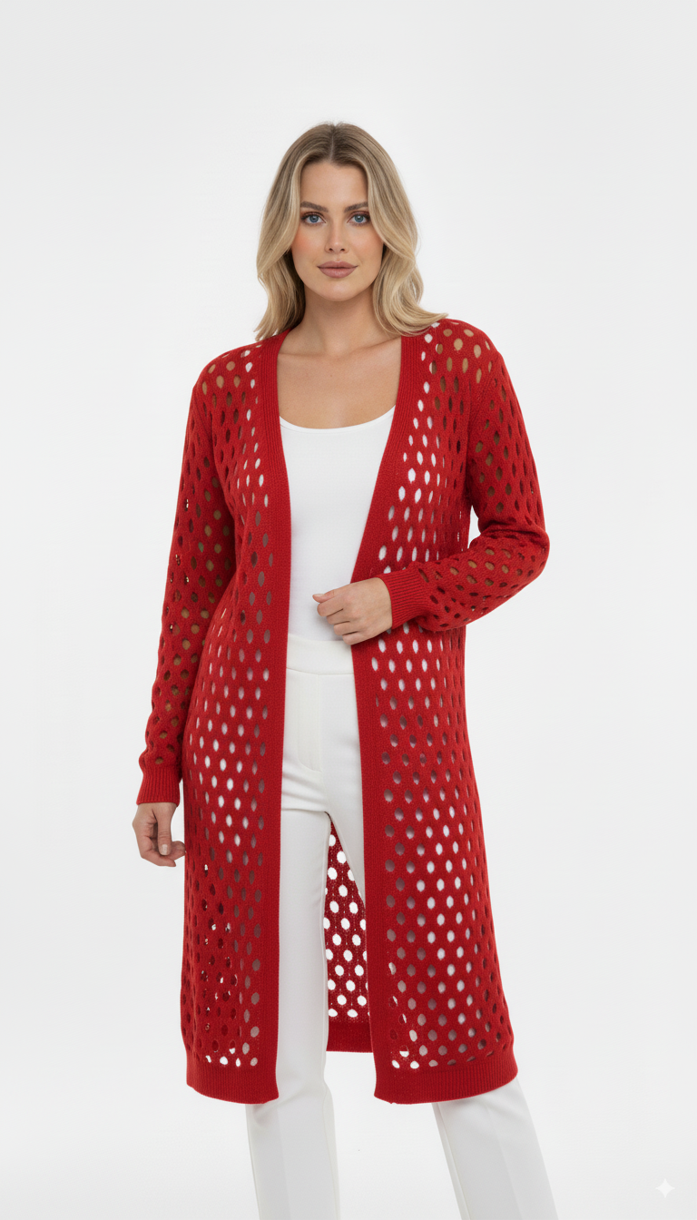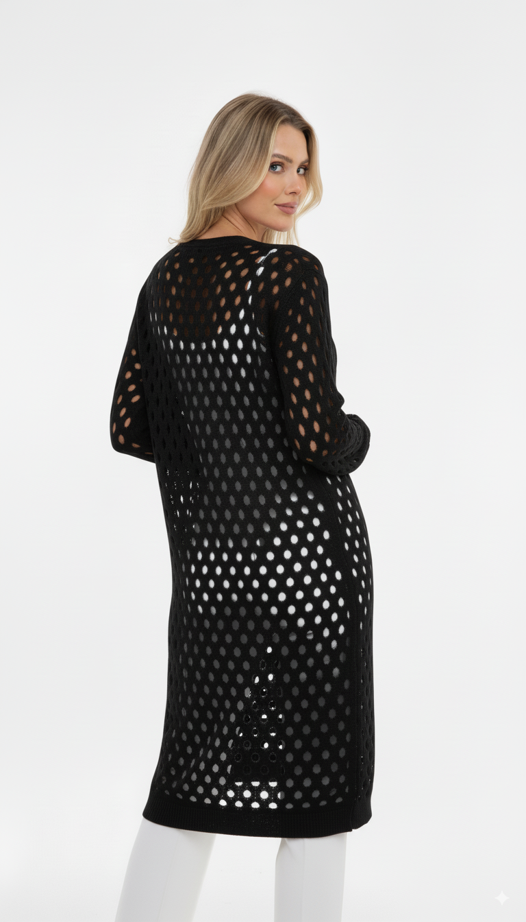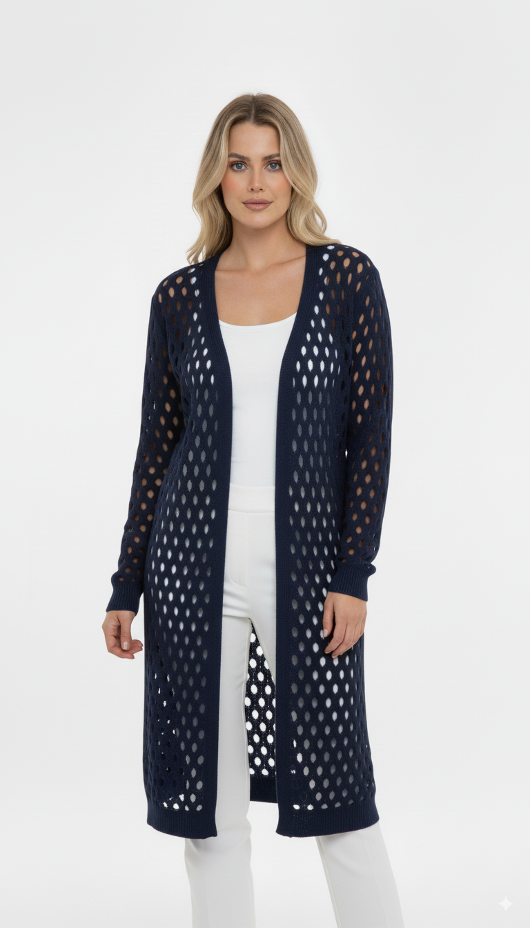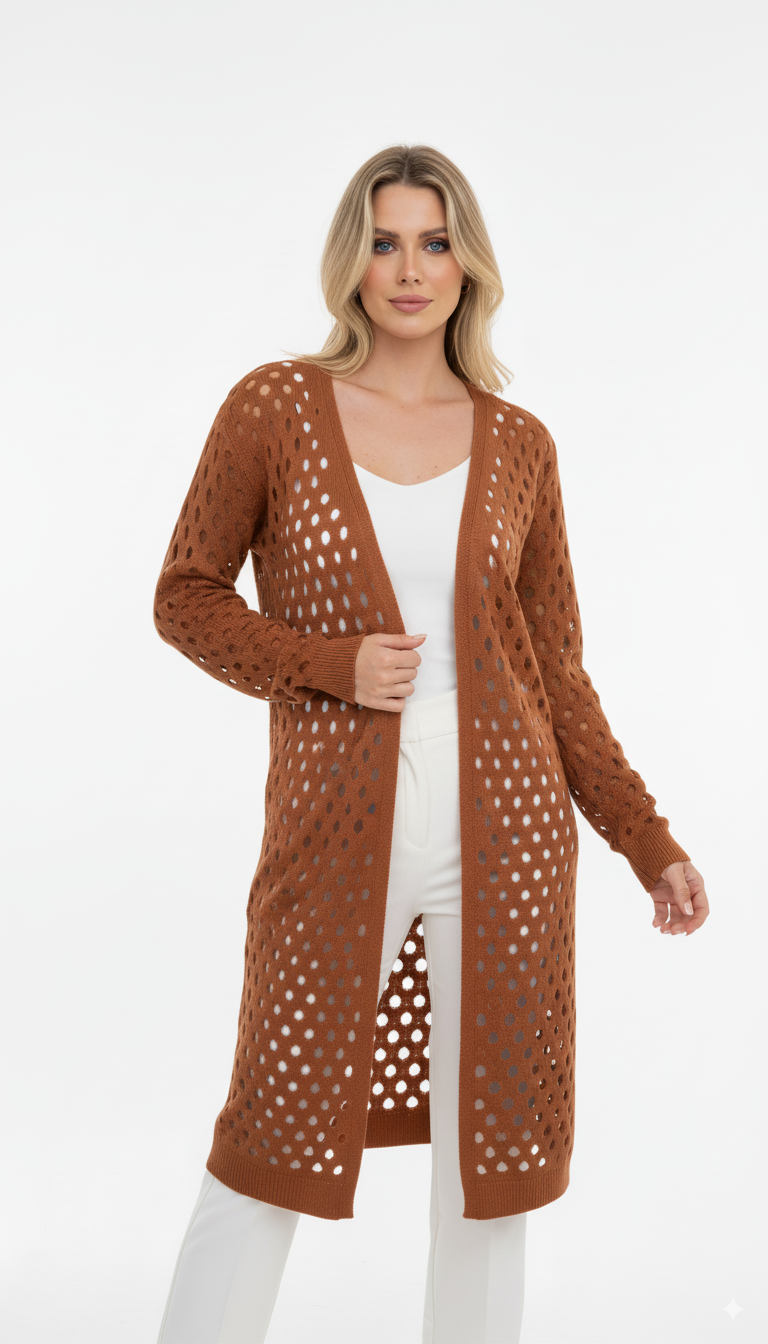 O Cardigan Vazado é a peça perfeita para dar leveza e estilo às suas produções. Confeccionado em tricot de alta qualidade, possui design alongado e detalhes vazados que trazem modernidade e sofisticação ao look. Versátil, pode ser usado sobre vestidos, tops ou blusas, compondo visuais elegantes para o dia a dia ou ocasiões especiais.