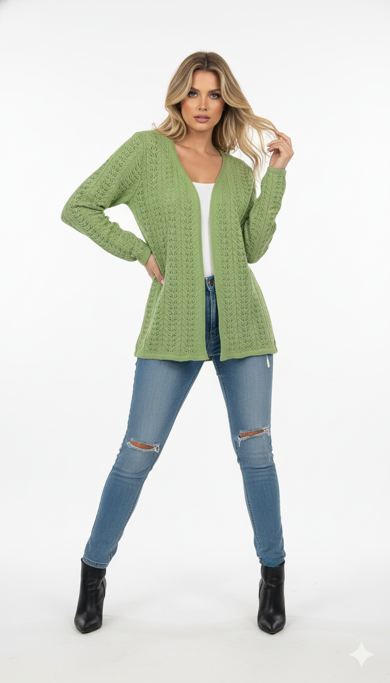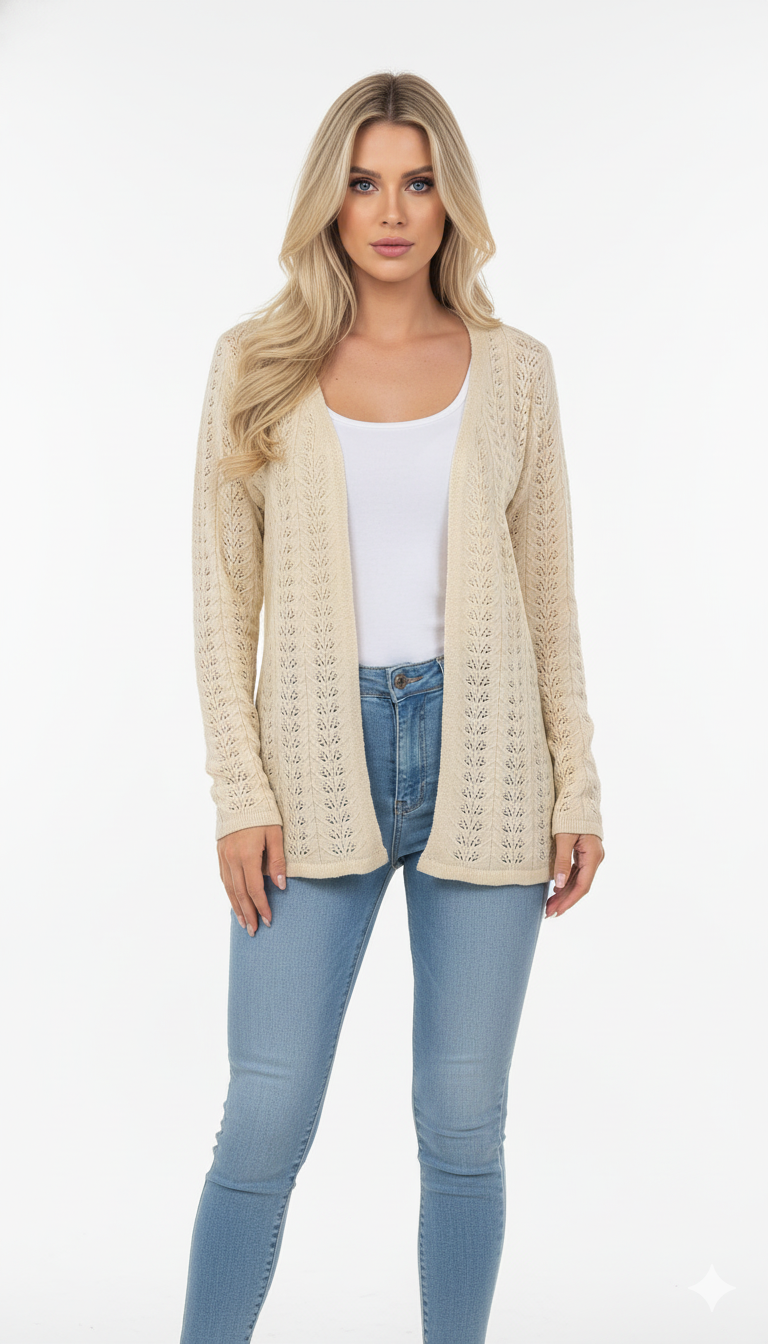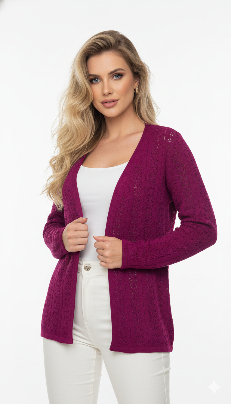 Seu trabalho rendado em tricot adiciona charme e feminilidade, enquanto a modelagem aberta e alongada proporciona um visual versátil e moderno.