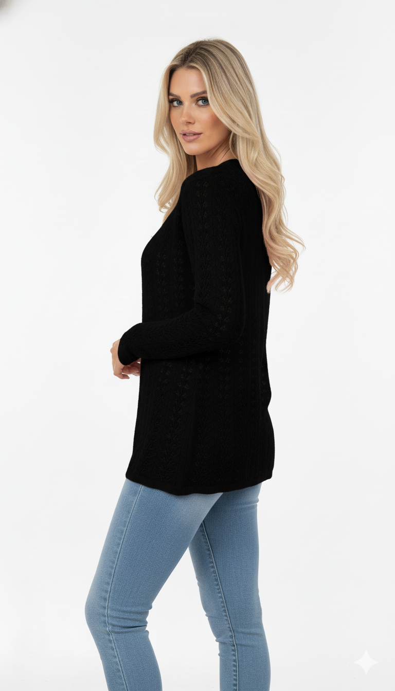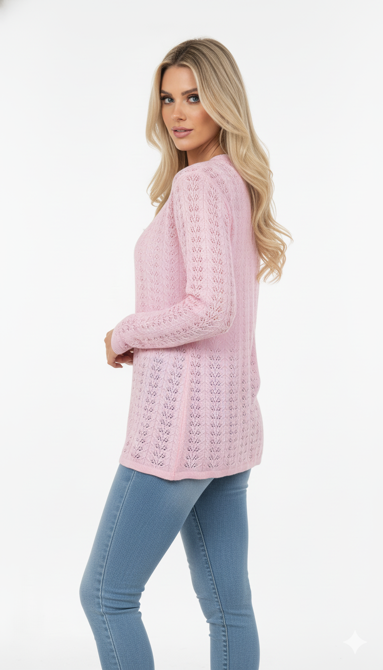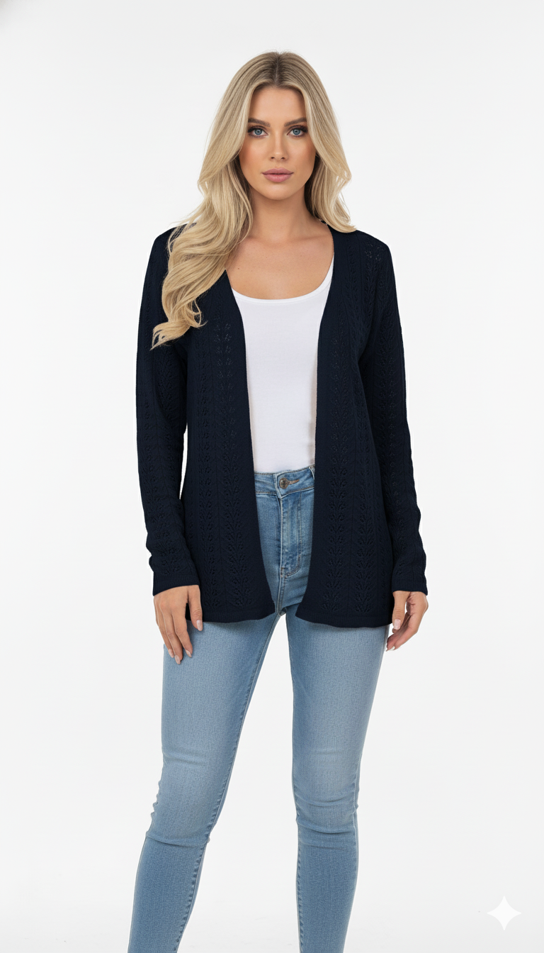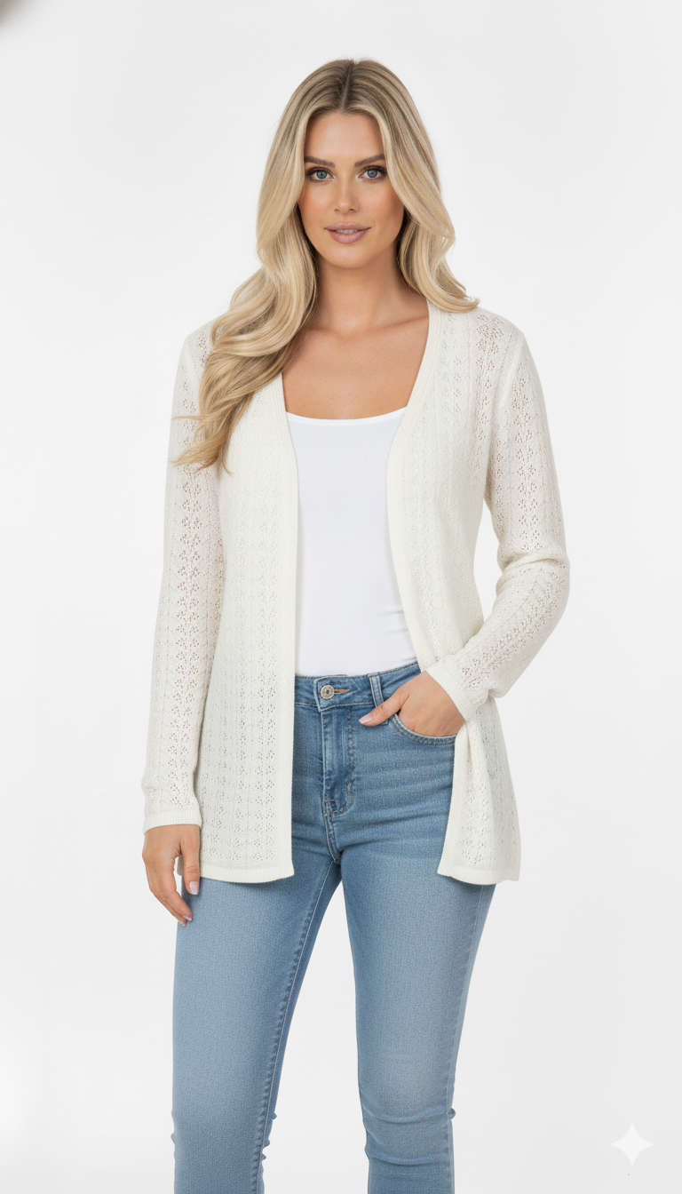 Seu trabalho rendado em tricot adiciona charme e feminilidade, enquanto a modelagem aberta e alongada proporciona um visual versátil e moderno.