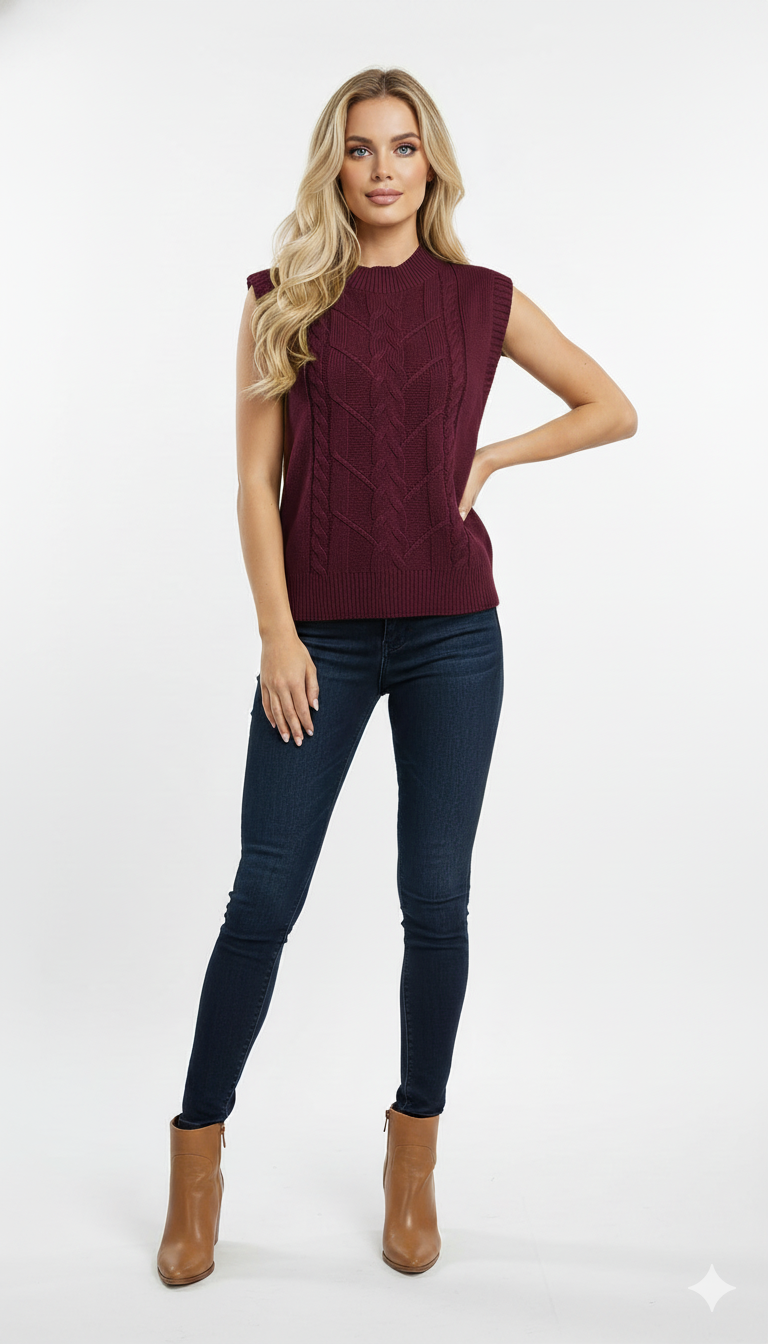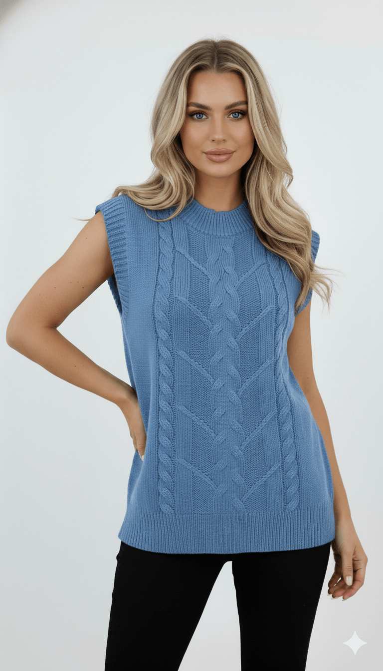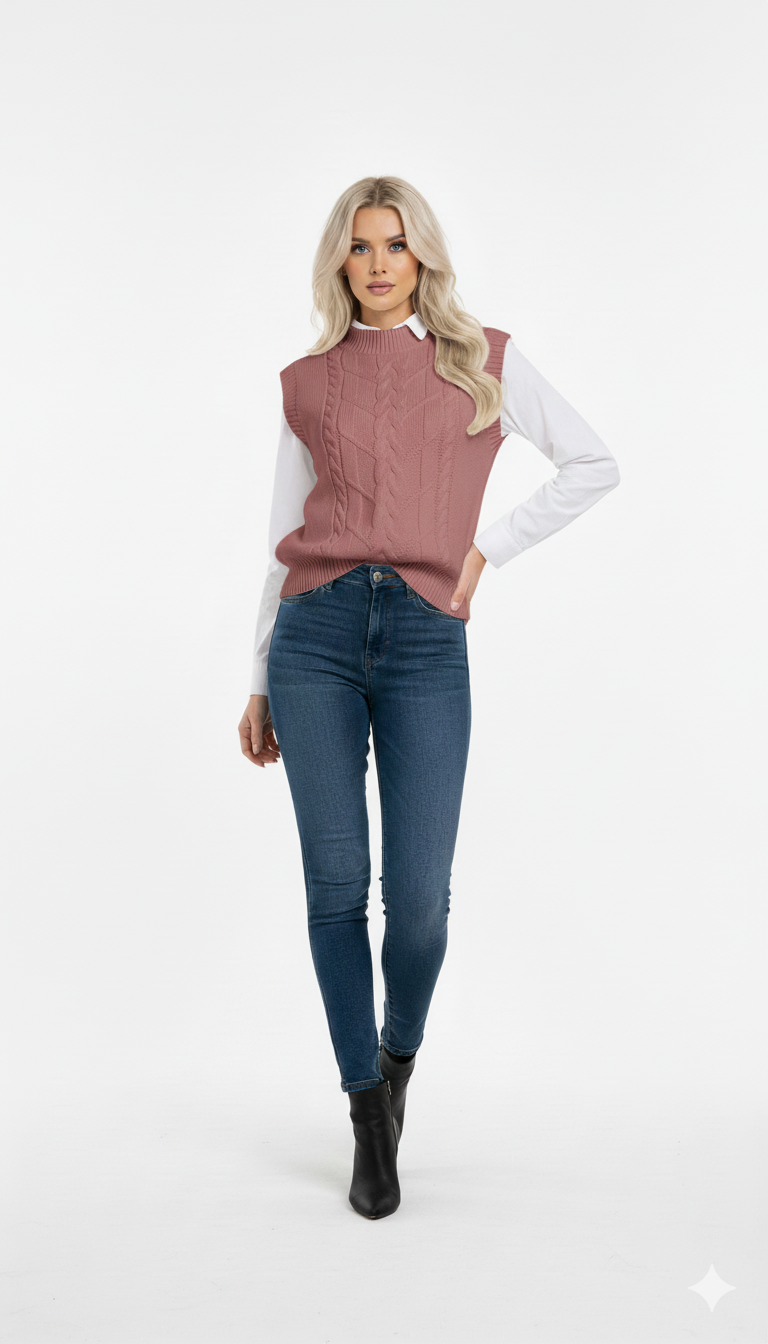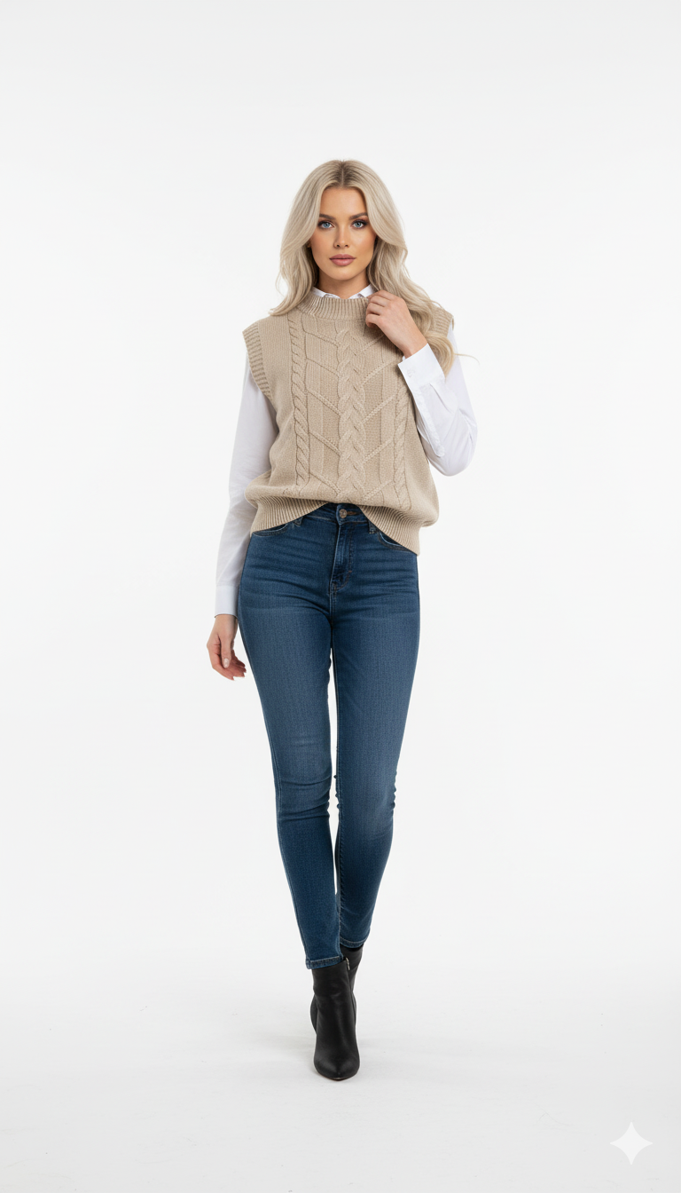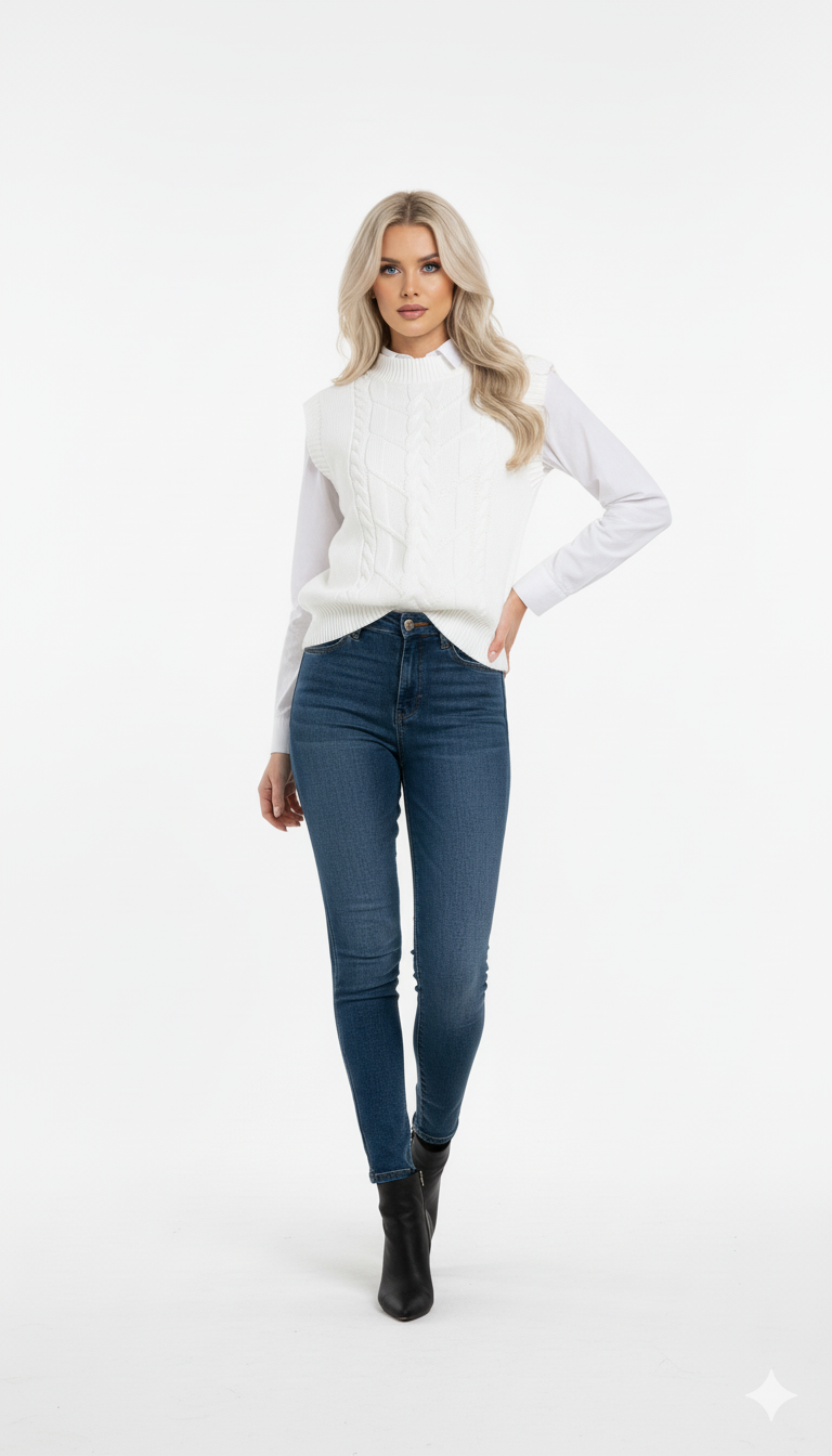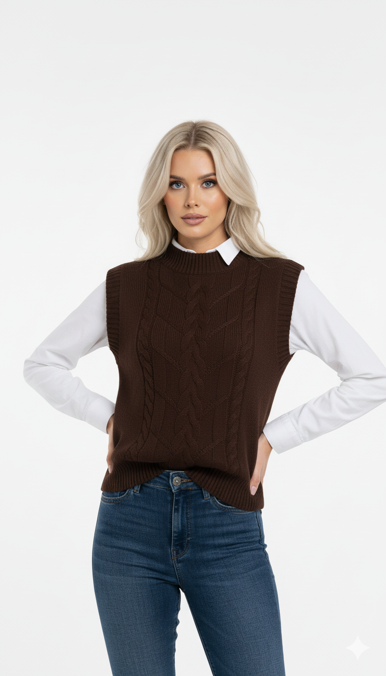 O Colete de Lã Feminino é uma peça clássica e indispensável para composições elegantes nos dias mais frescos. Confeccionado em tricot de lã com trama trançada, ele oferece um visual sofisticado, com textura rica e acabamento impecável.