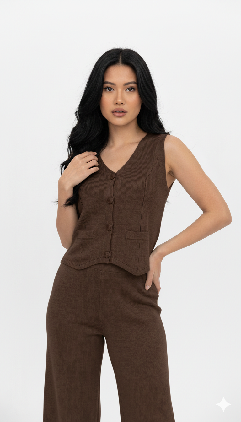 O conjunto sândalo traduz sofisticação minimalista com conforto absoluto. Confeccionado em tricot leve e macio, ele é composto por colete com abotoamento frontal e calça de caimento fluido, formando um visual moderno, elegante e extremamente versátil.
