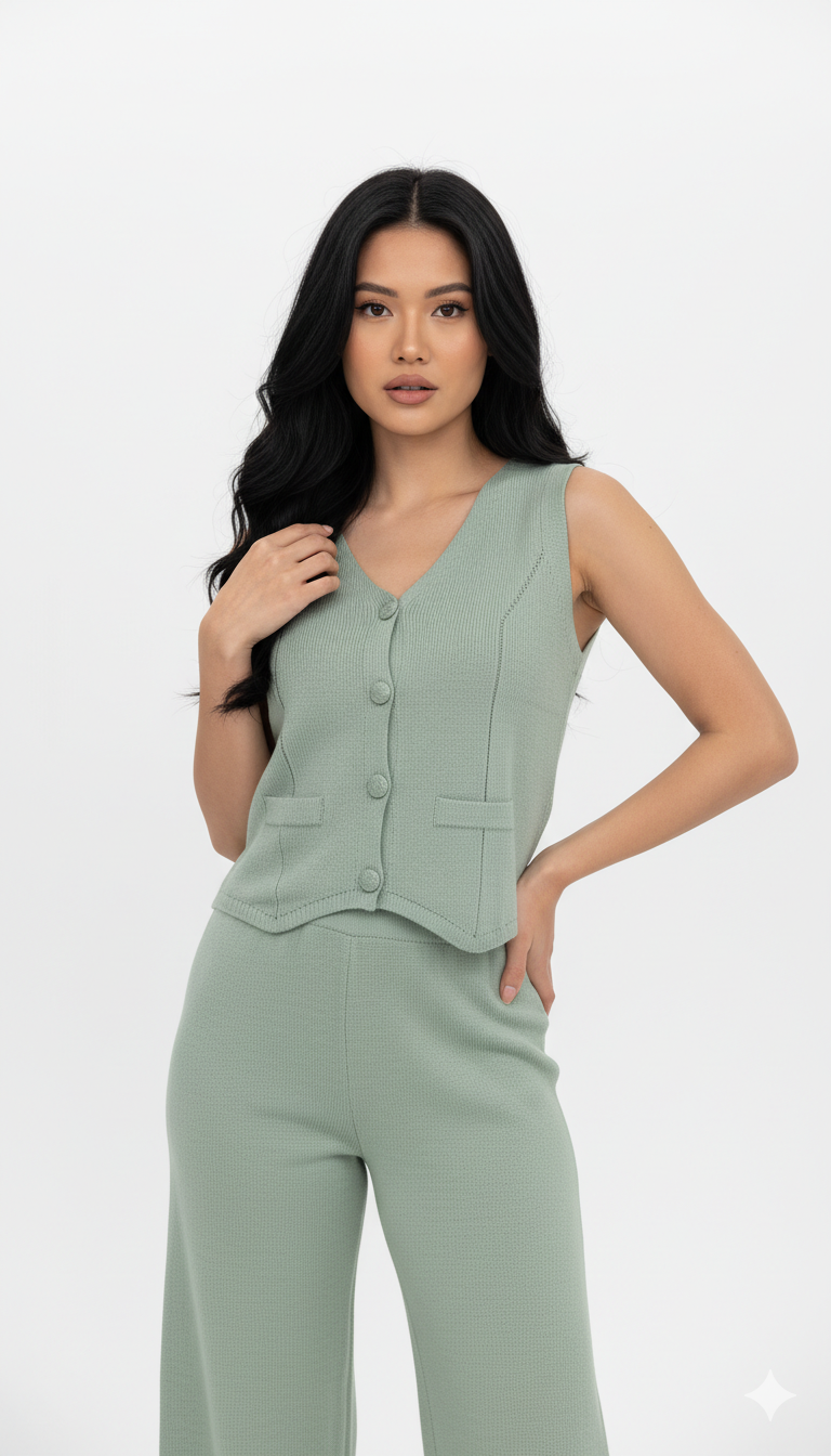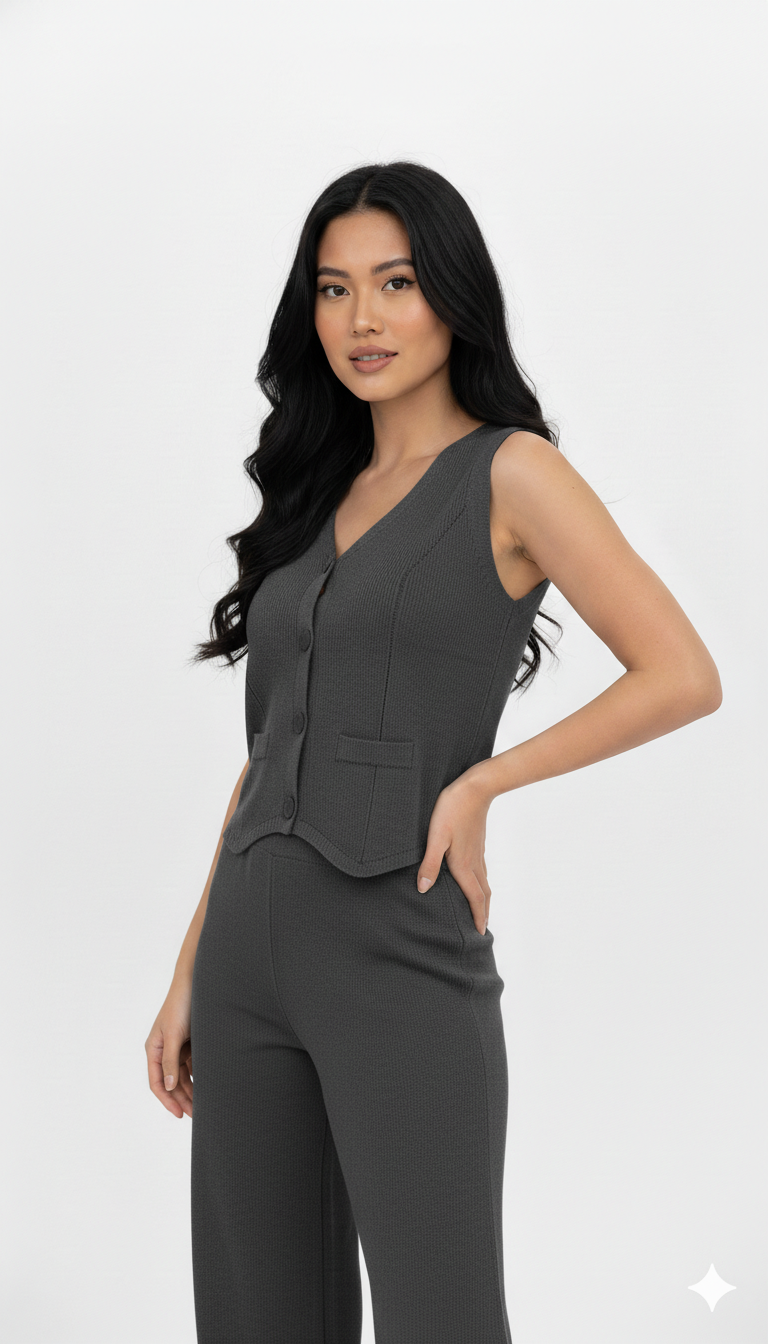 O colete apresenta modelagem estruturada que valoriza a silhueta, com gola em V e detalhes sutis que elevam o acabamento da peça. A calça possui cintura confortável e pernas amplas, garantindo leveza, movimento e um visual alongado.