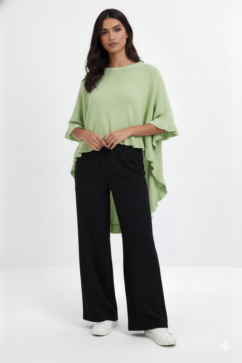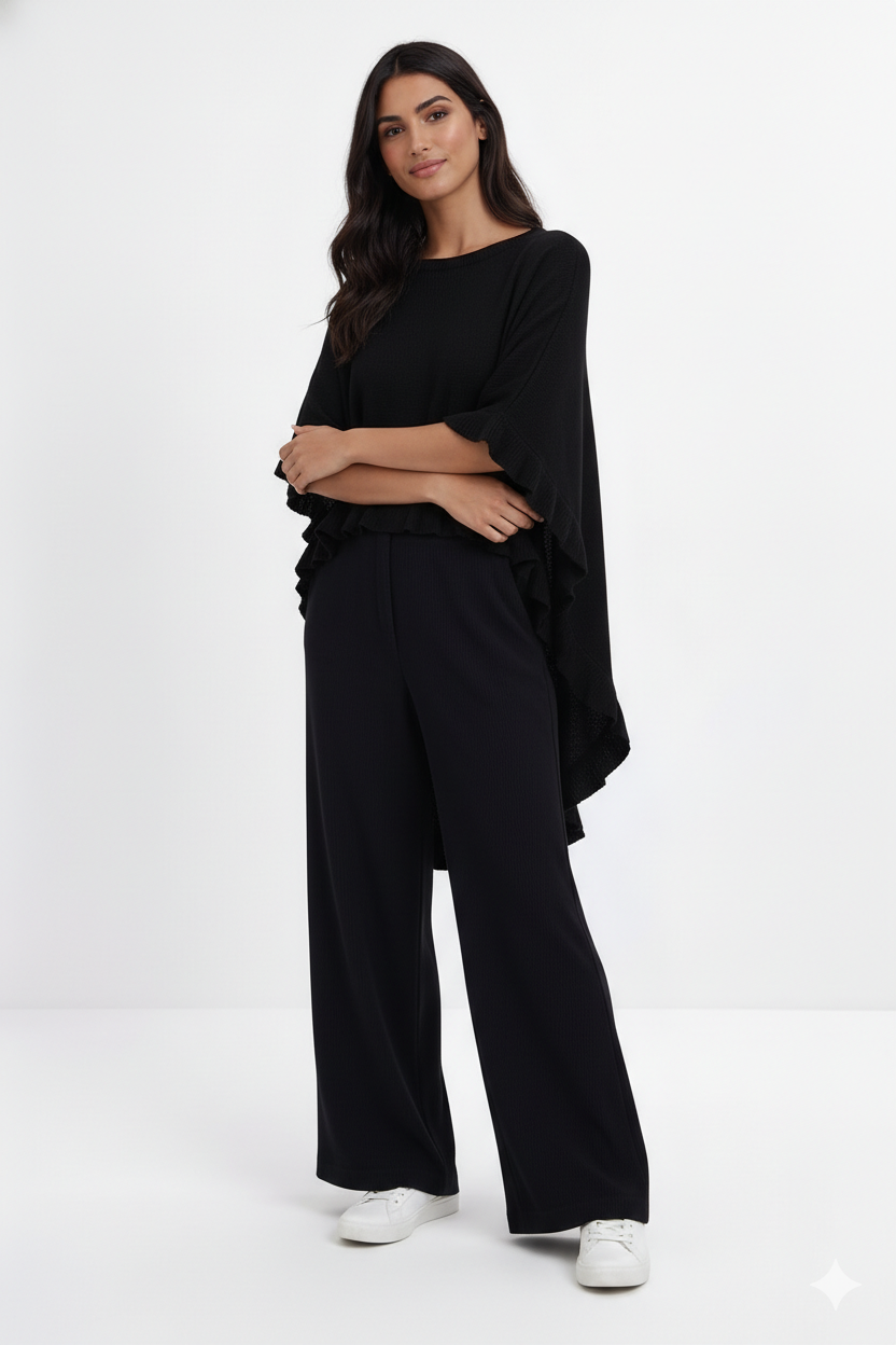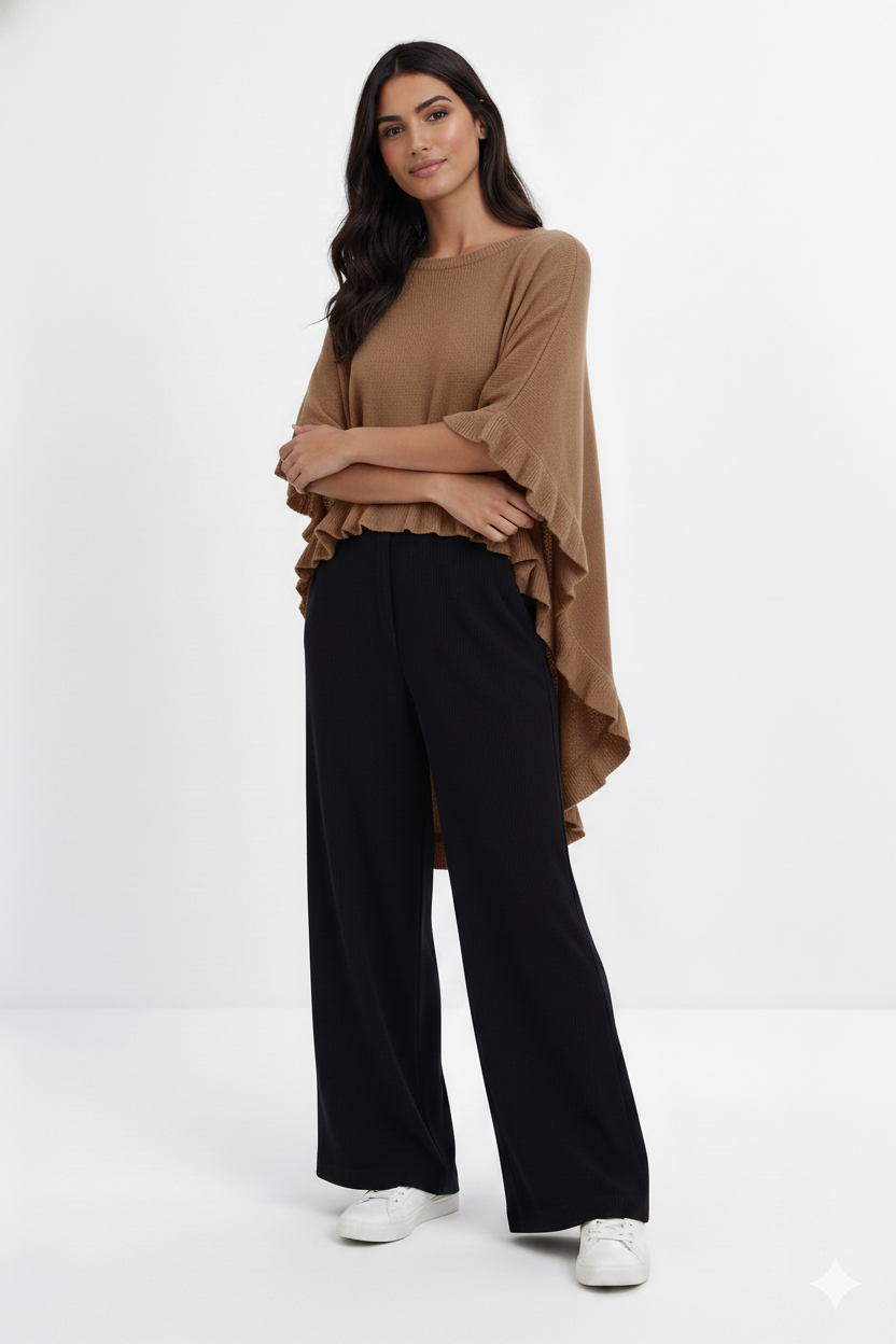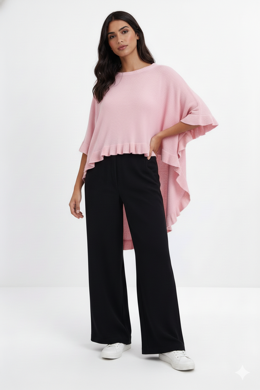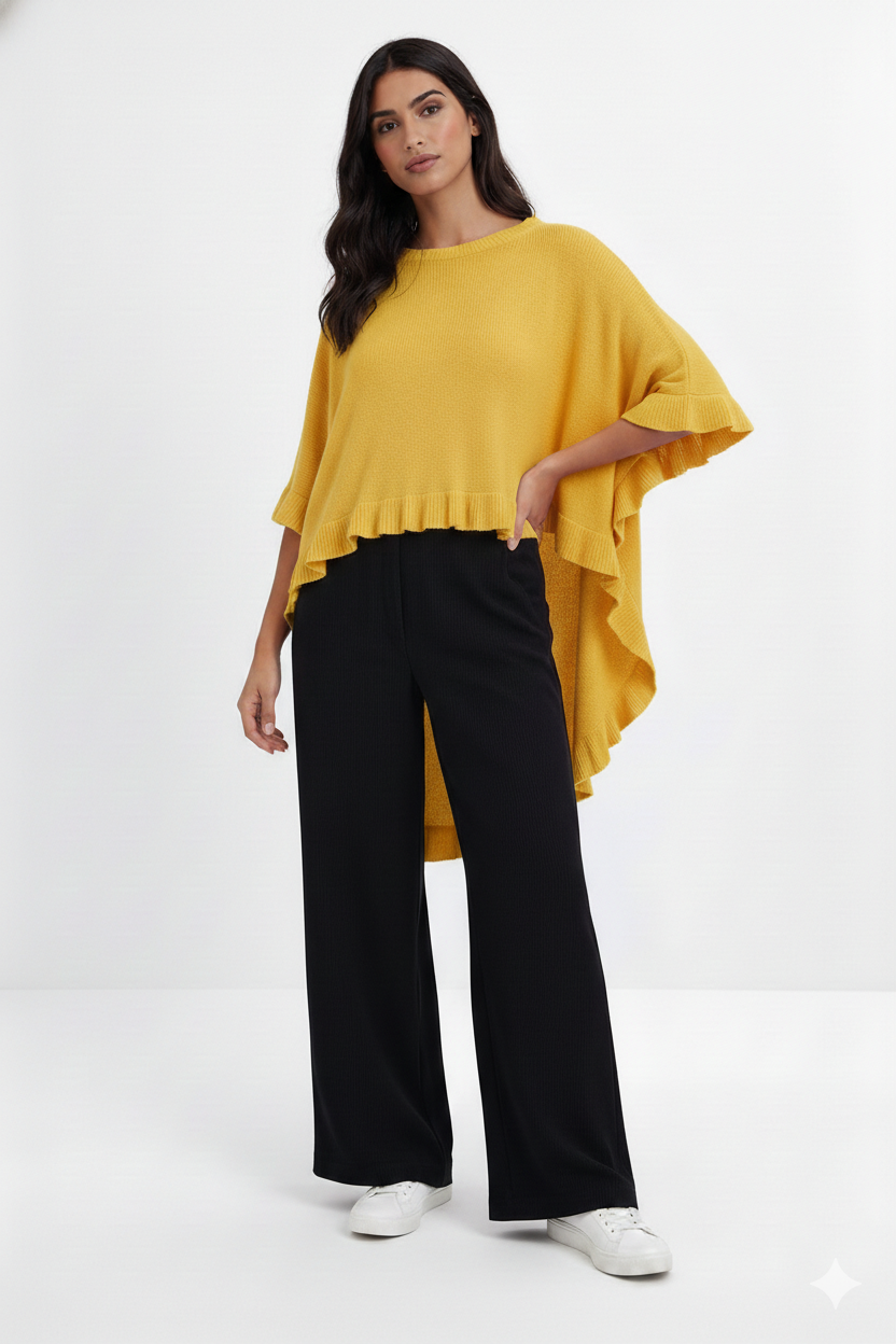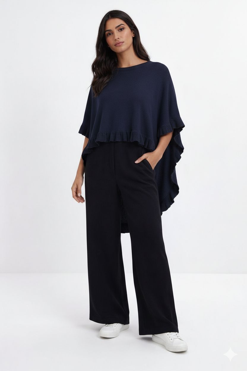 O destaque fica por conta dos babados delicados na barra, que adicionam charme e feminilidade ao design, tornando a peça única e cheia de personalidade. Ideal para composições modernas, o poncho pode ser usado tanto em looks casuais quanto em produções mais elaboradas.