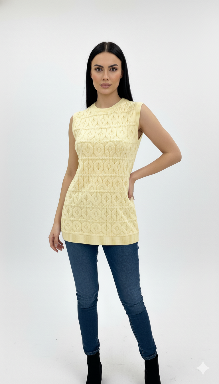 Sua modelagem reta proporciona excelente caimento, enquanto o design sem mangas permite combinações variadas — perfeita para usar sozinha nos dias amenos ou com sobreposições em produções de meia estação e inverno.