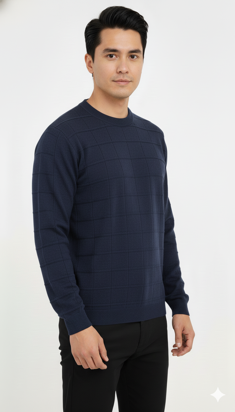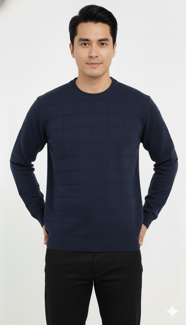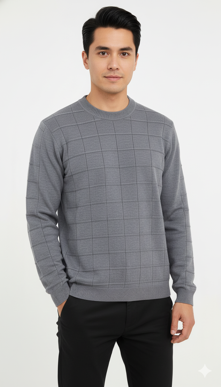 Seu diferencial está na padronagem quadriculada discreta, que adiciona sofisticação e personalidade à peça sem abrir mão da elegância. A modelagem clássica e o acabamento refinado tornam o suéter perfeito para diversas ocasiões.