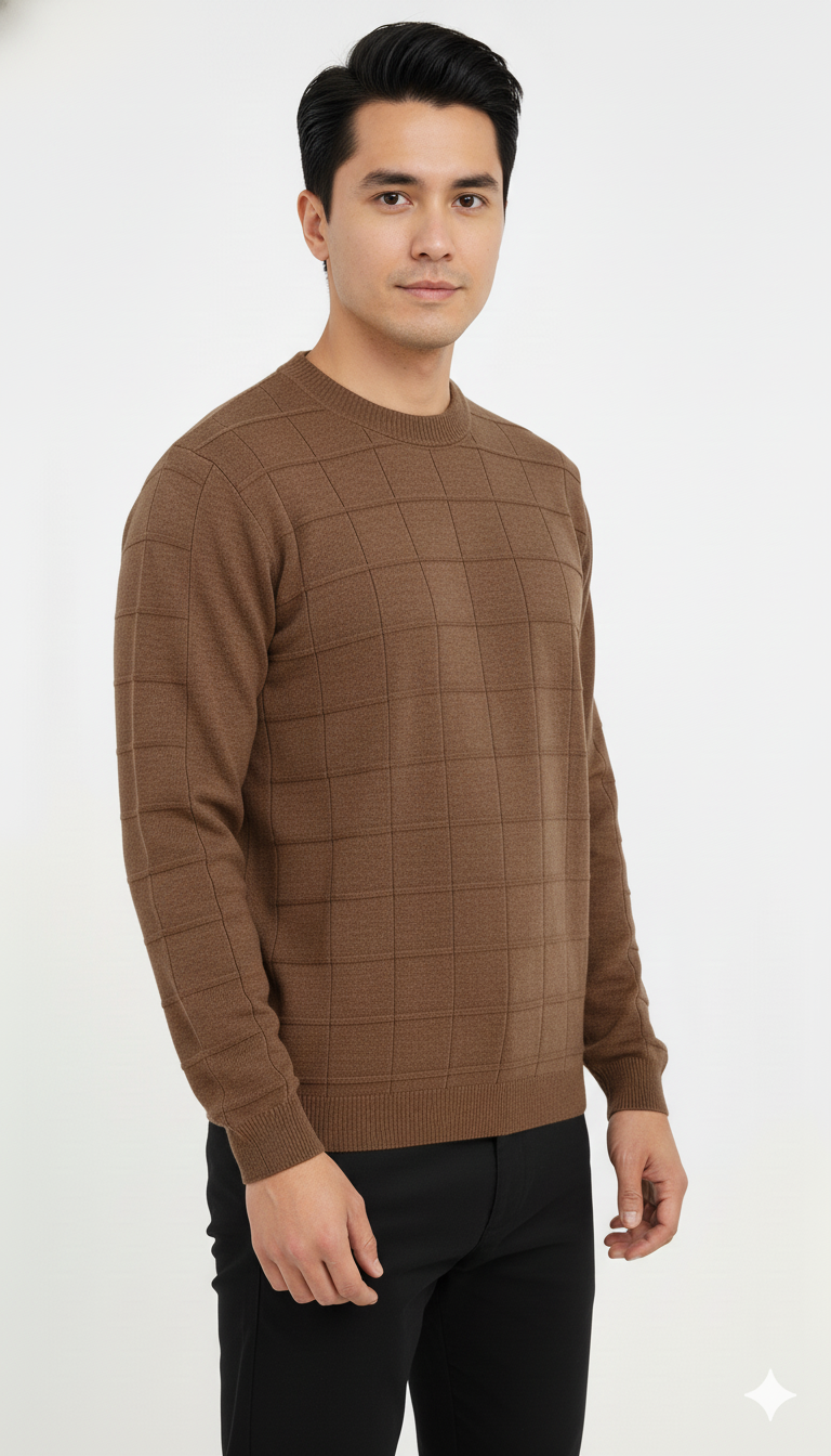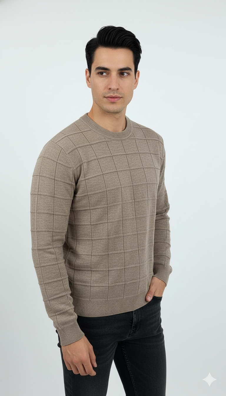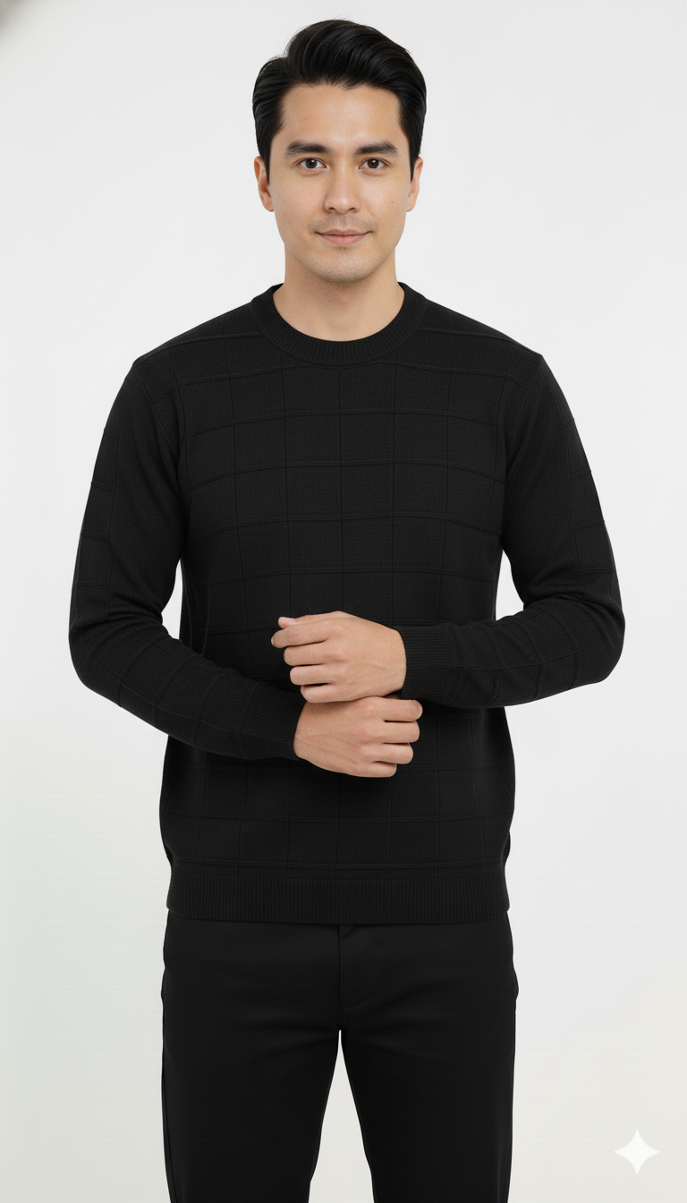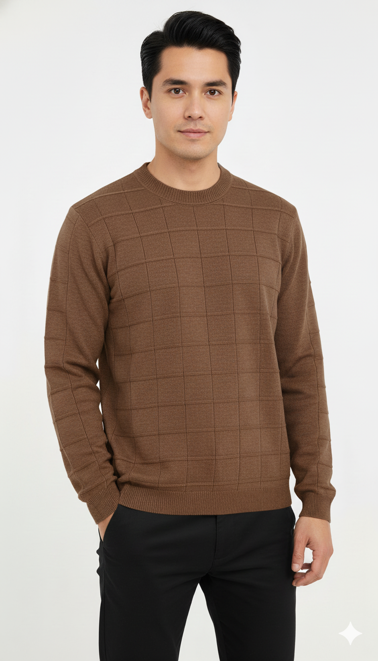 Seu diferencial está na padronagem quadriculada discreta, que adiciona sofisticação e personalidade à peça sem abrir mão da elegância. A modelagem clássica e o acabamento refinado tornam o suéter perfeito para diversas ocasiões.