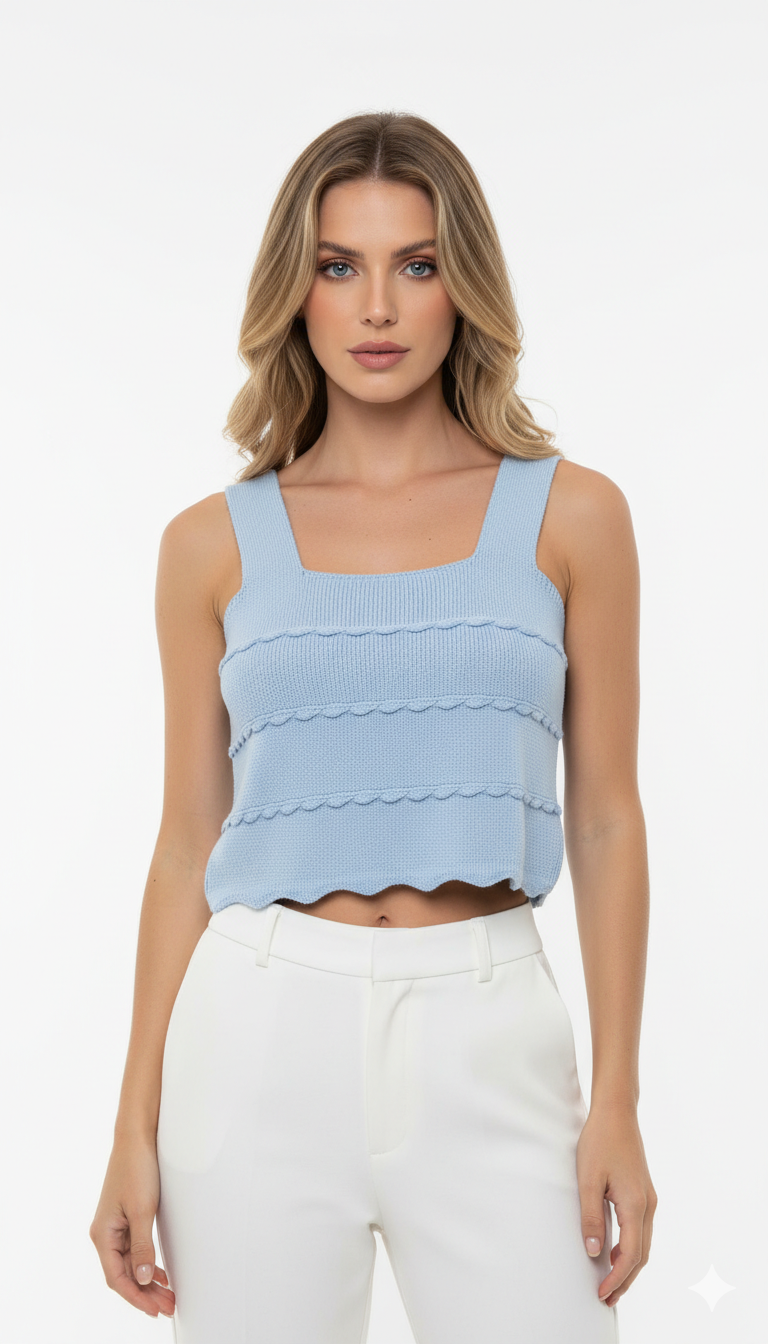 Com alças largas e decote reto, o modelo valoriza o colo de forma elegante, garantindo conforto e segurança ao vestir. A barra com acabamento ondulado adiciona um toque artesanal e diferenciado, deixando a peça ainda mais especial.