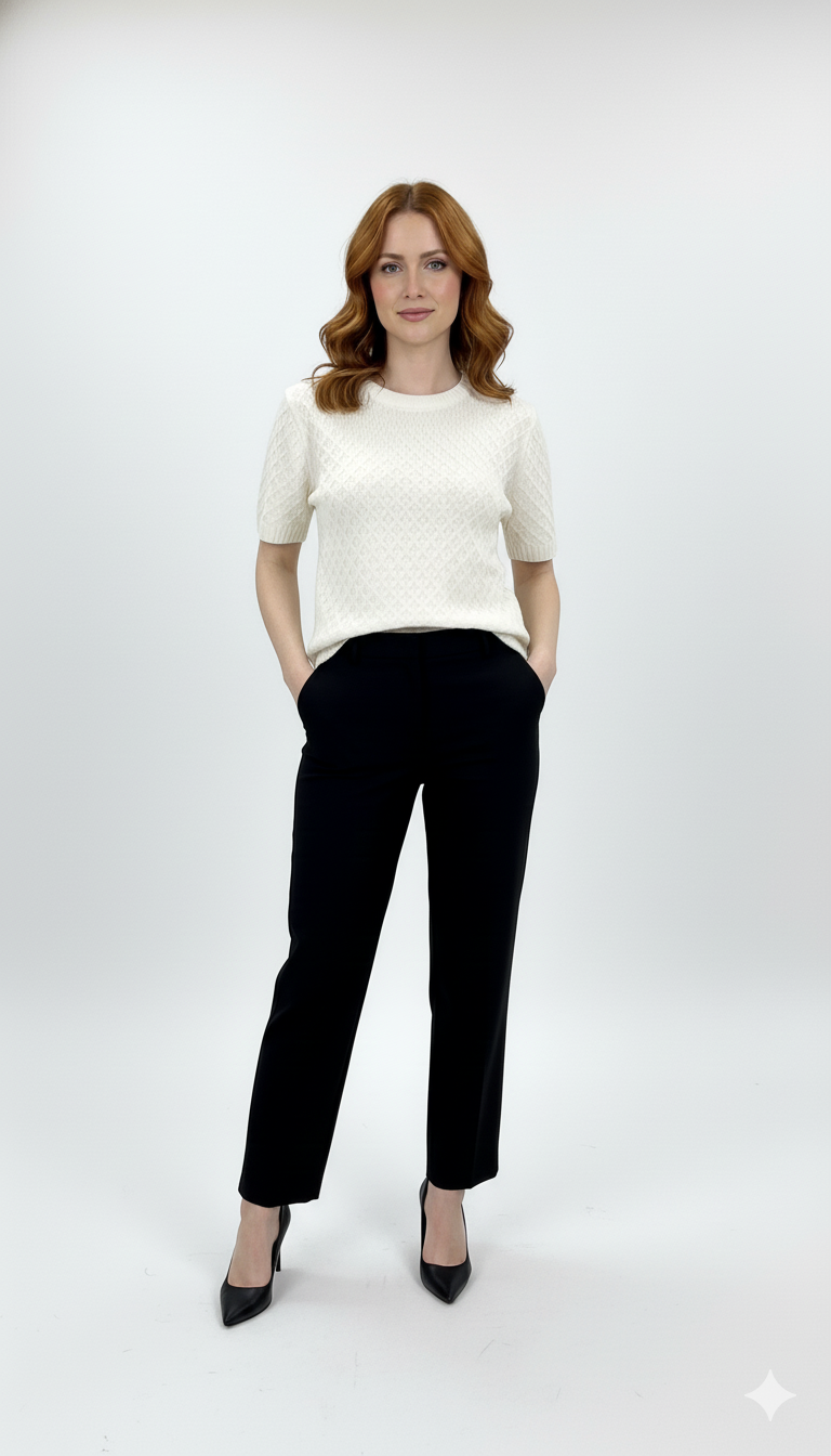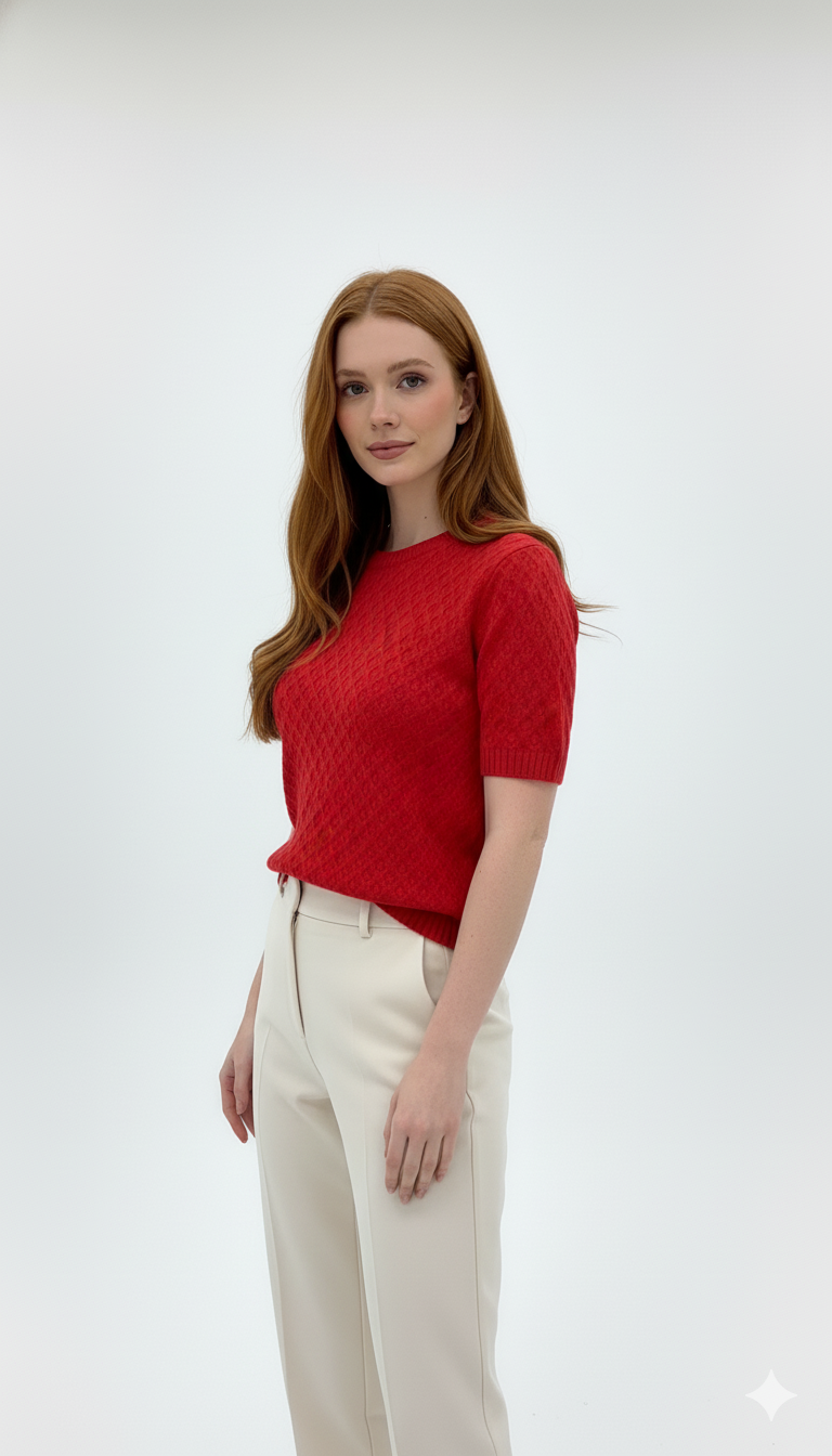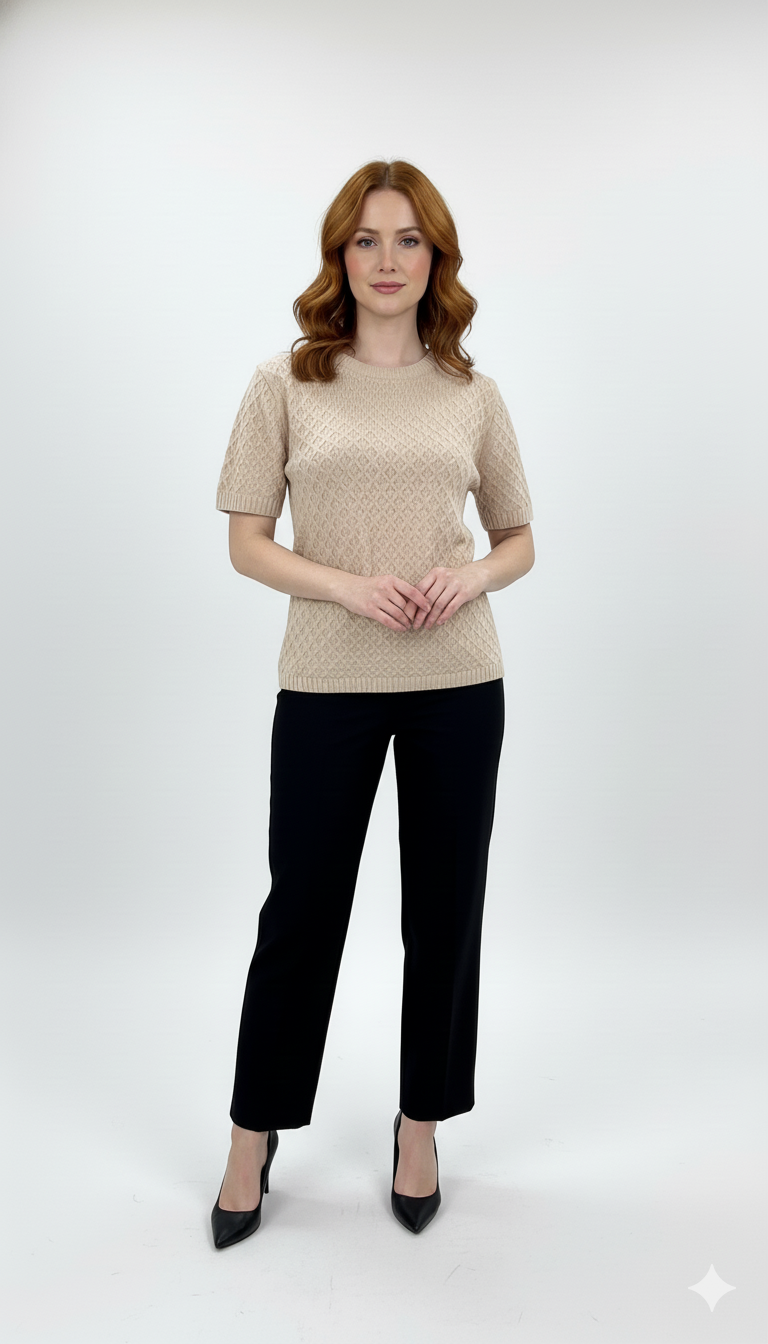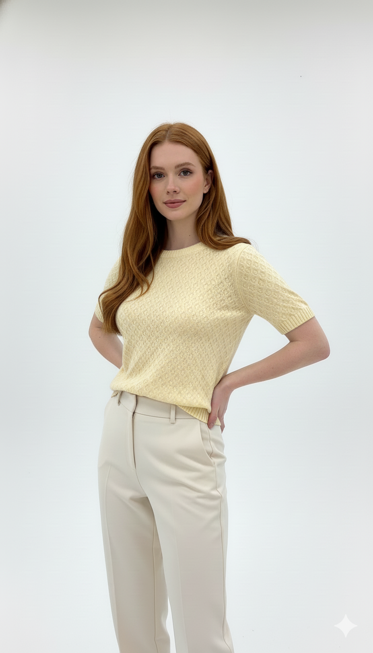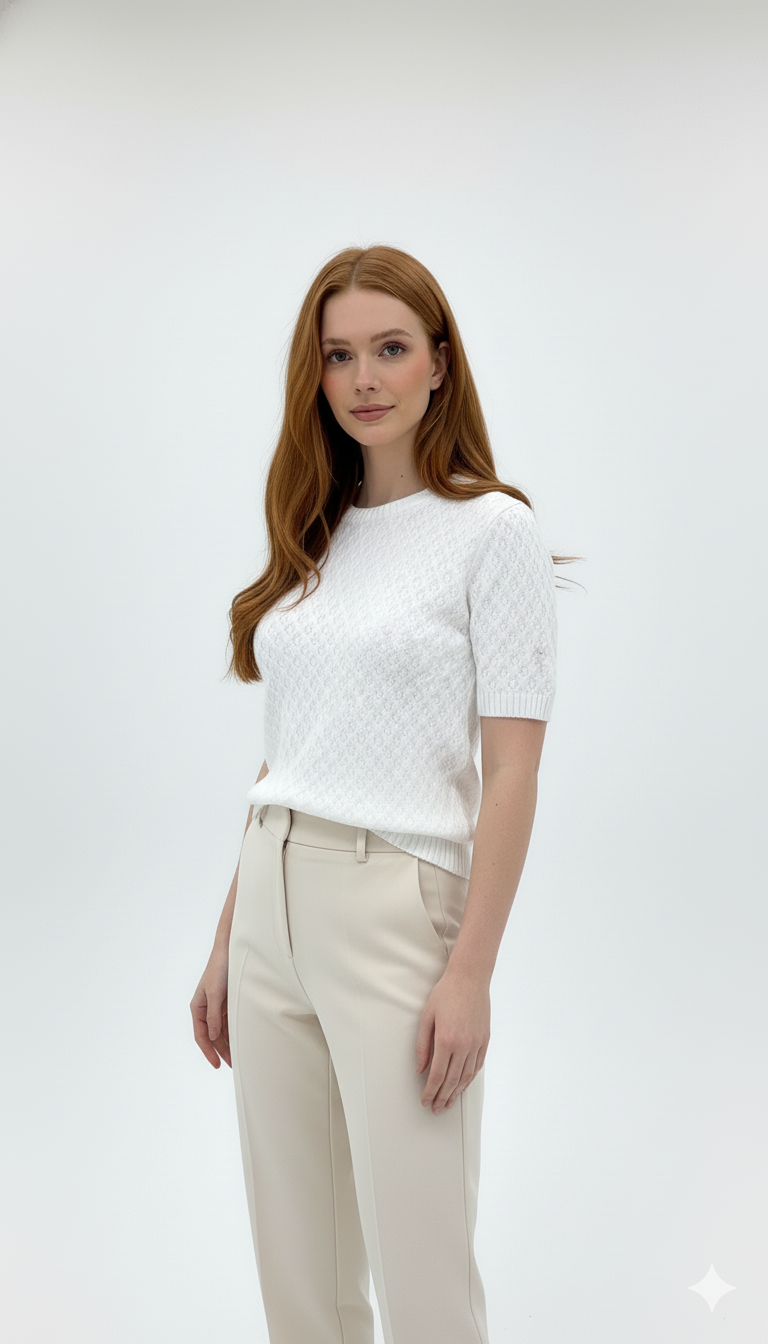 Seu diferencial está no trabalho em ponto bolinha (textura pipoquinha discreta), que traz charme e sofisticação de forma sutil. O design possui modelagem reta com mangas curtas e gola redonda canelada, garantindo um visual moderno e versátil.