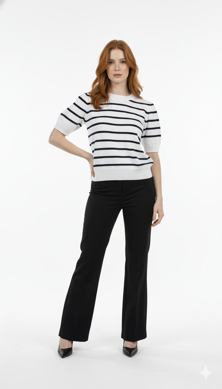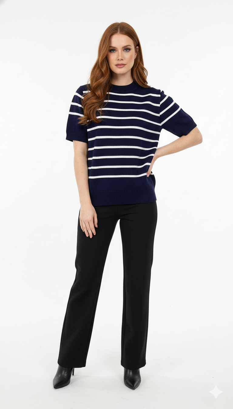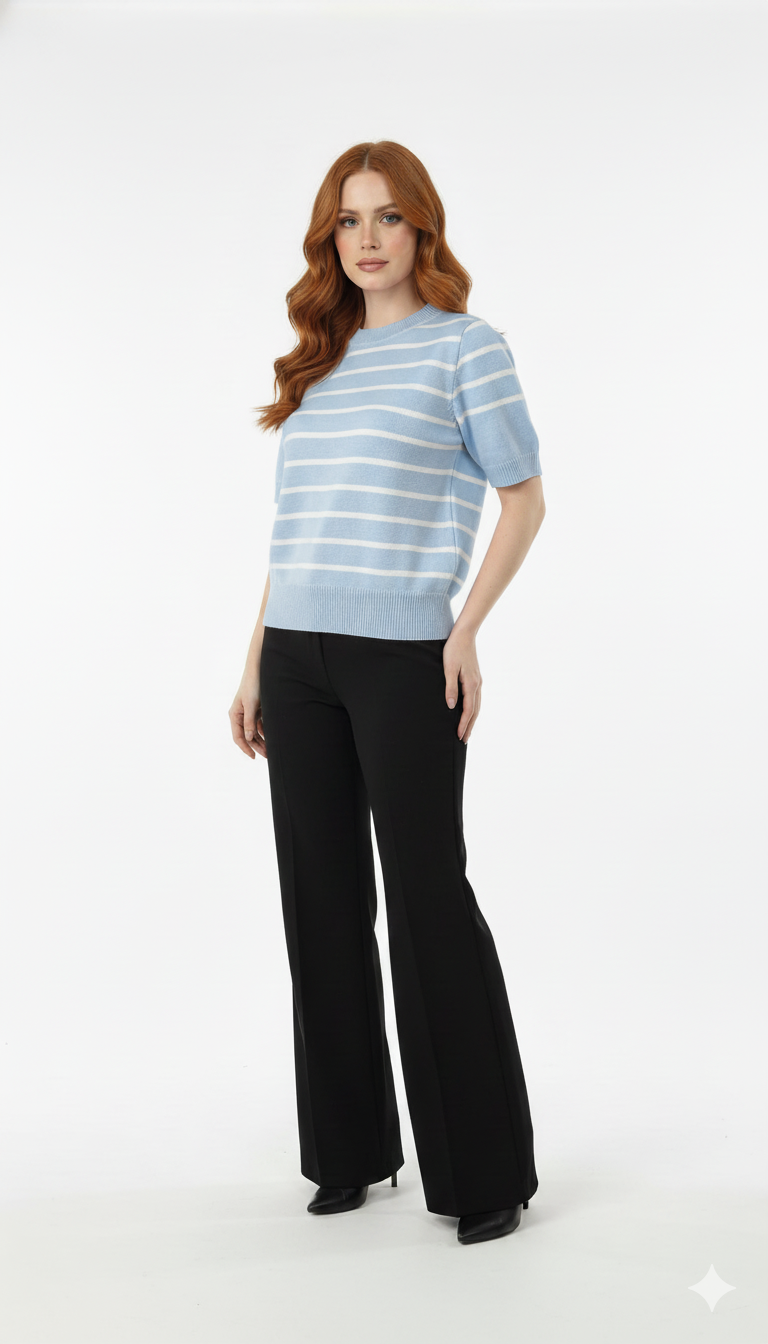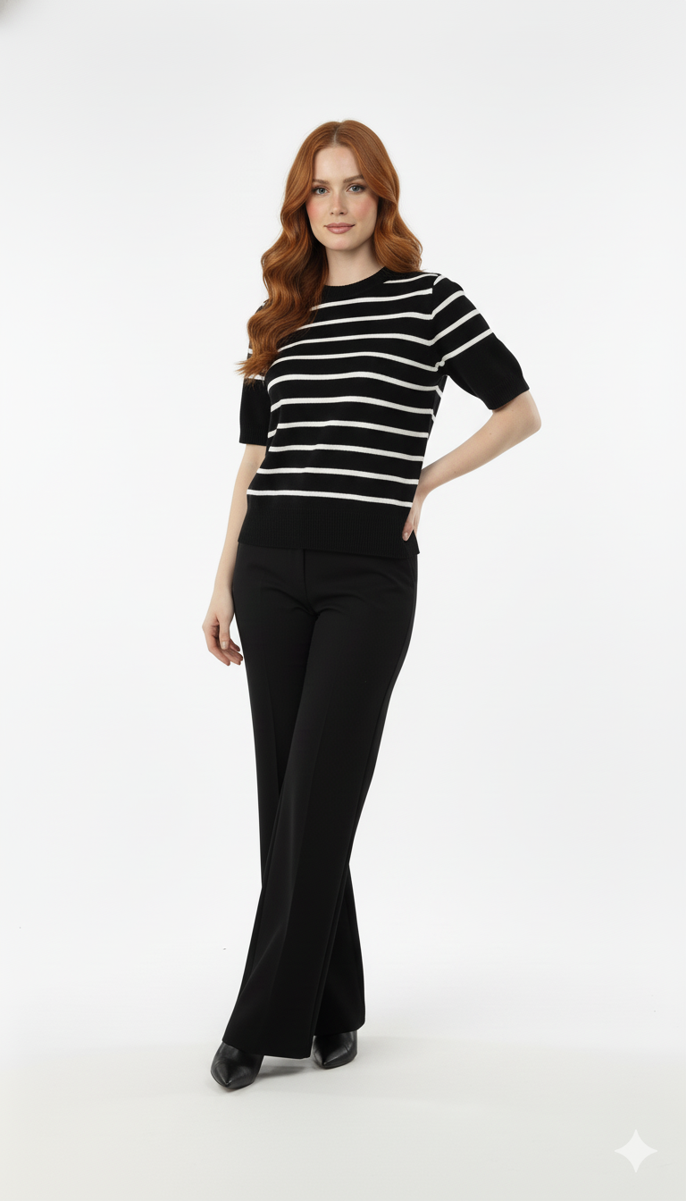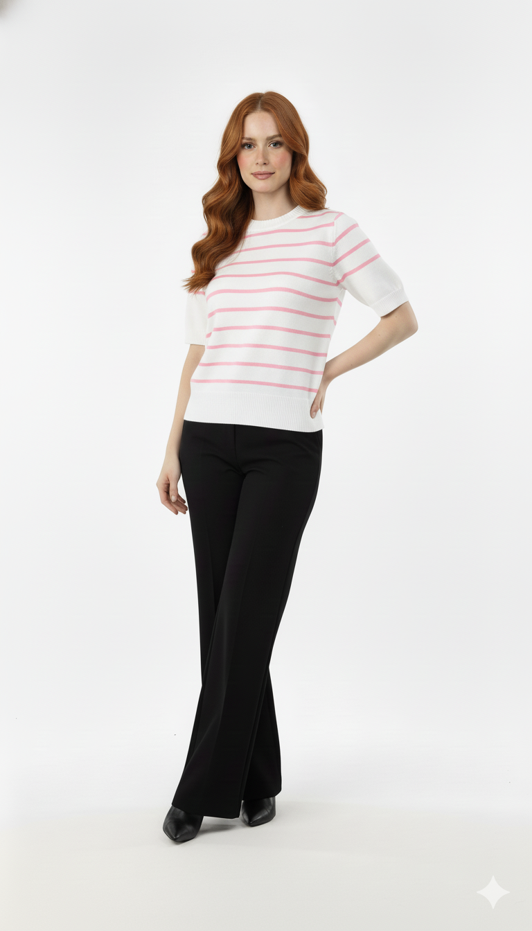 Com listras delicadas e design minimalista, o modelo possui mangas curtas, gola redonda canelada e barra ajustada, proporcionando uma silhueta elegante sem perder o conforto.