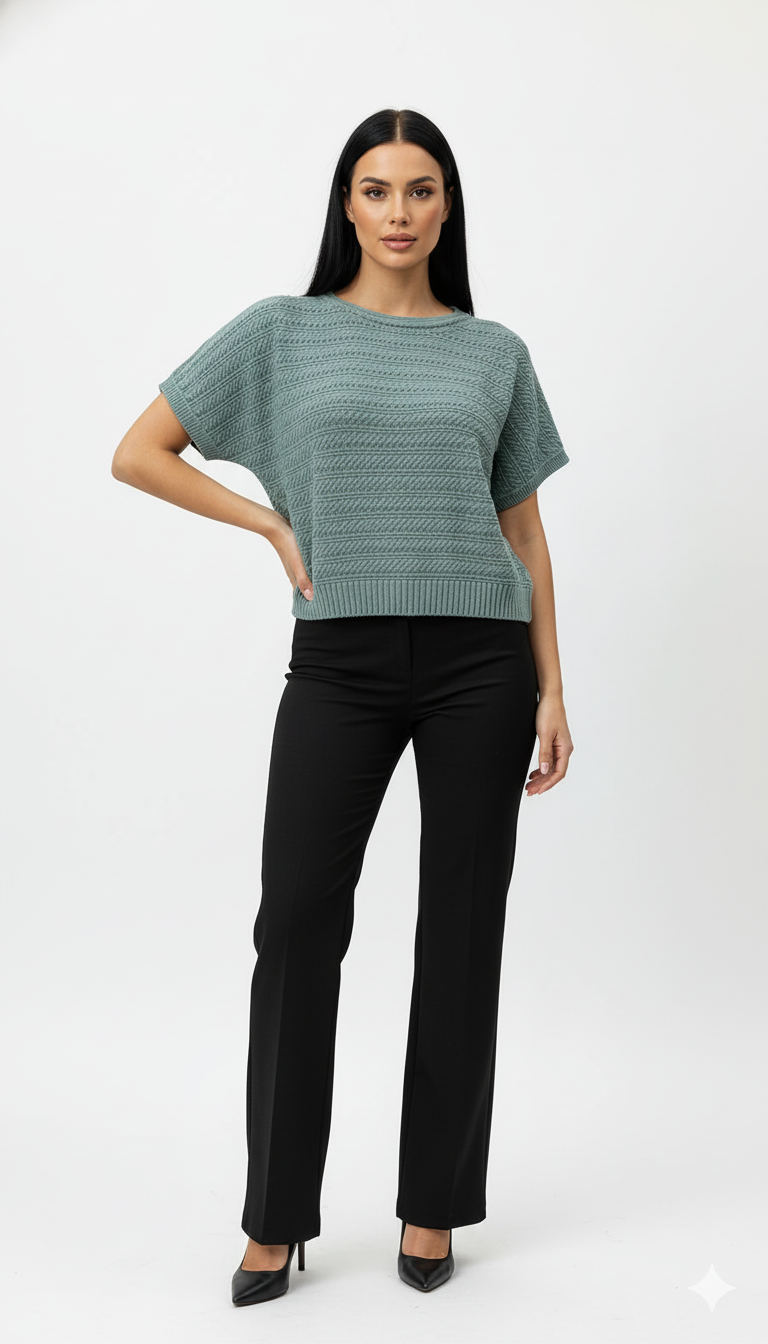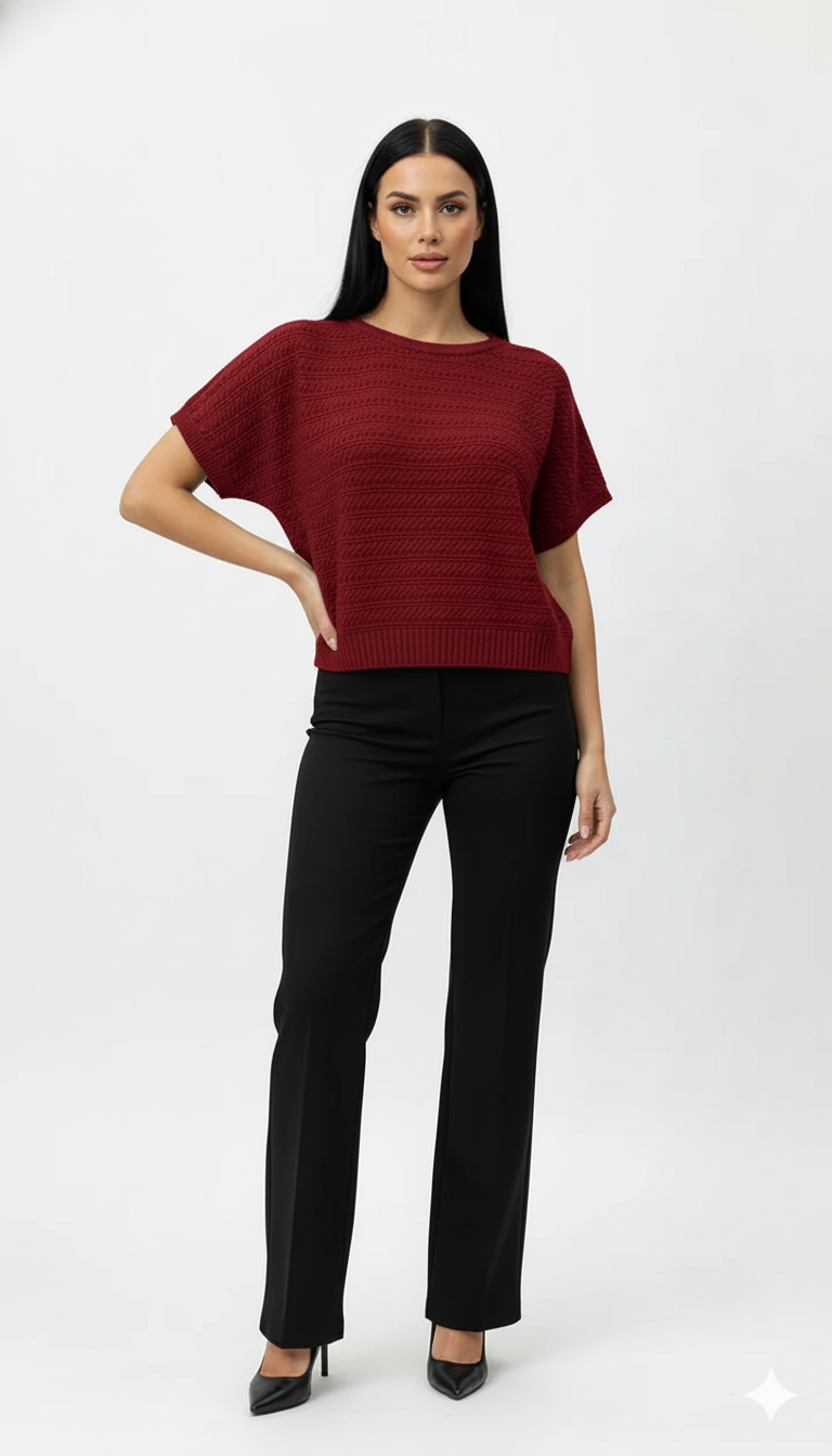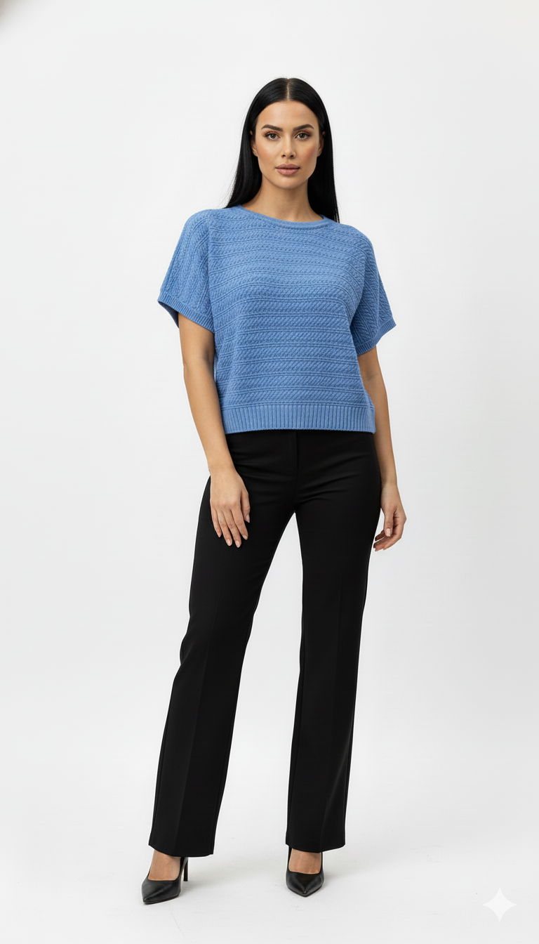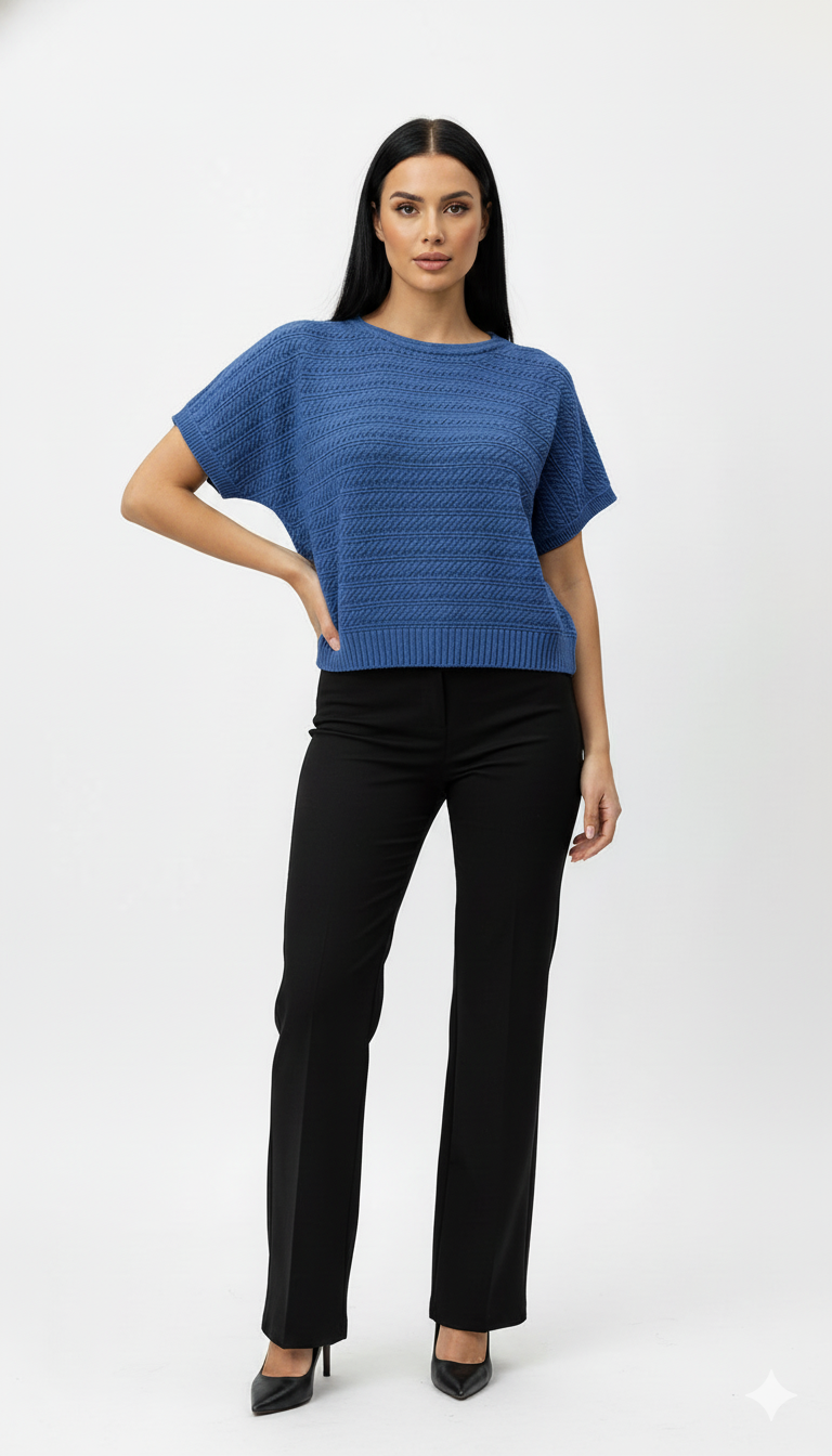 A T-shirt Morcego Vazadinha Tricot Feminina é a escolha ideal para quem busca conforto, elegância e leveza no dia a dia. Confeccionada em tricot modal de alta qualidade, a peça possui textura delicada com pontos vazados sutis, que proporcionam um toque sofisticado e moderno ao visual.